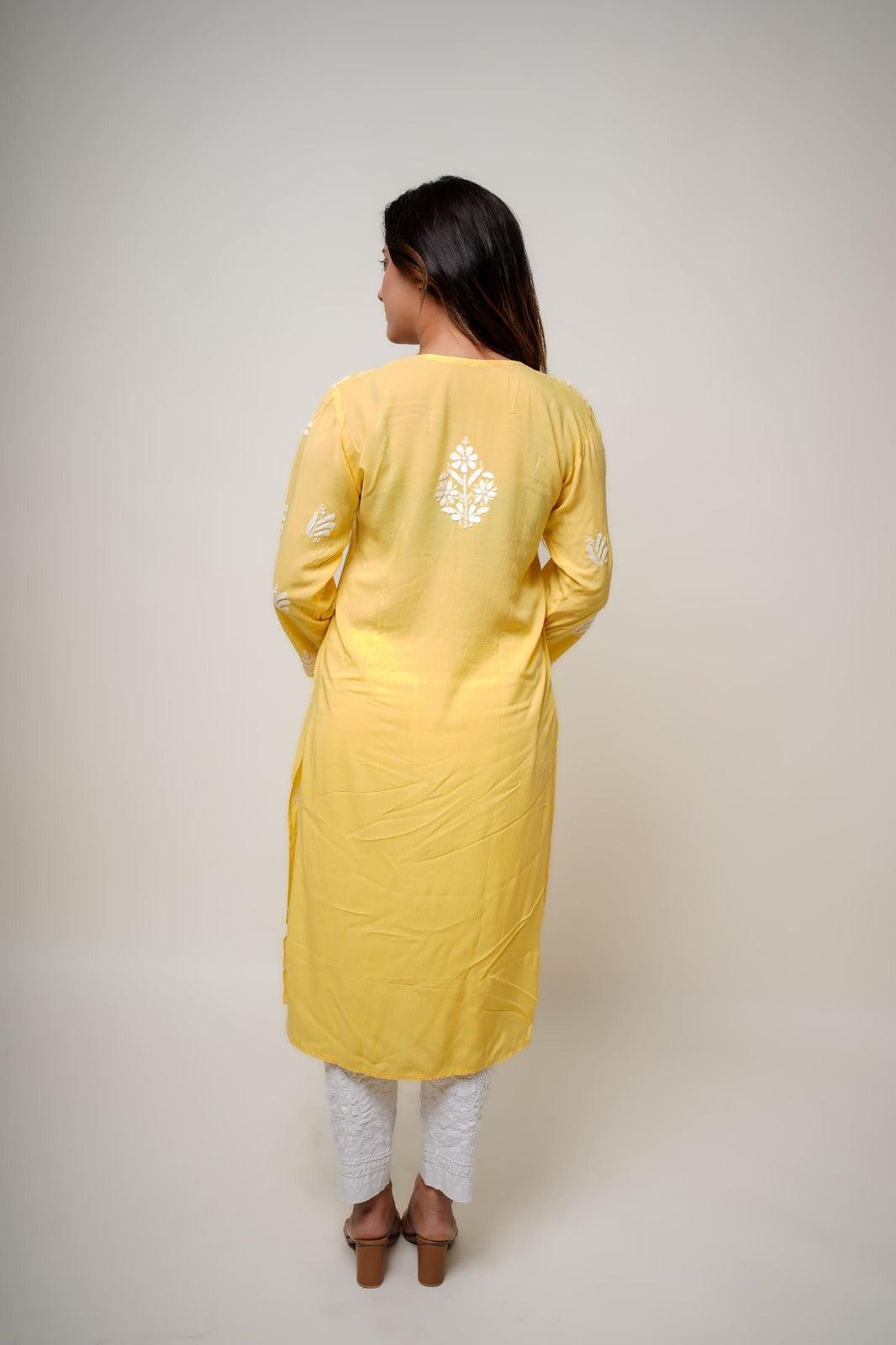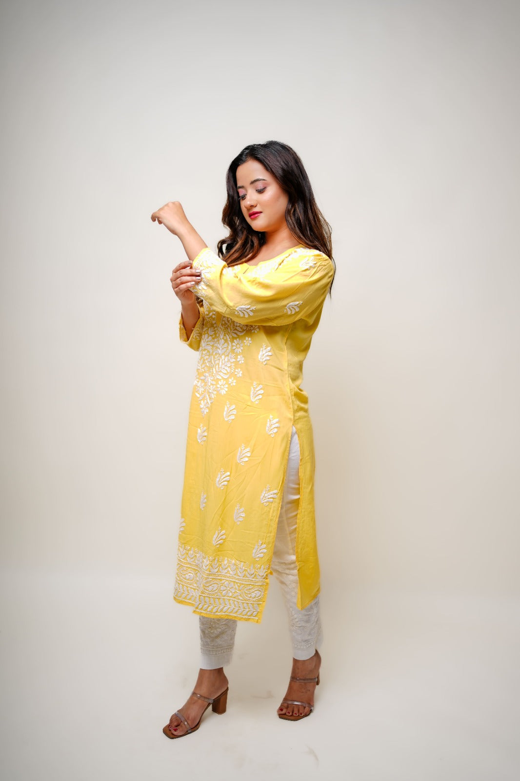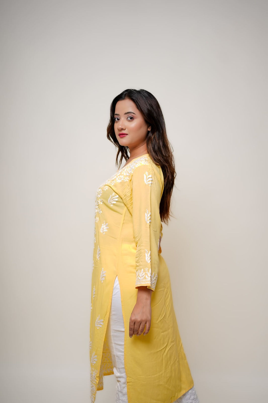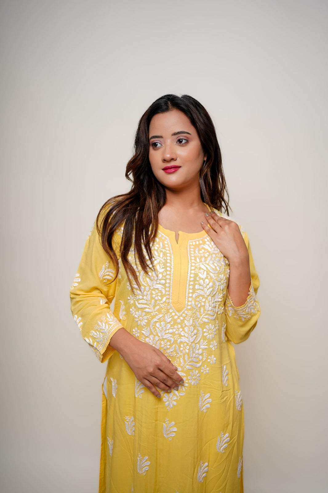 Chikankari hand embroidered | Long Kurta | Mudal | Yellow