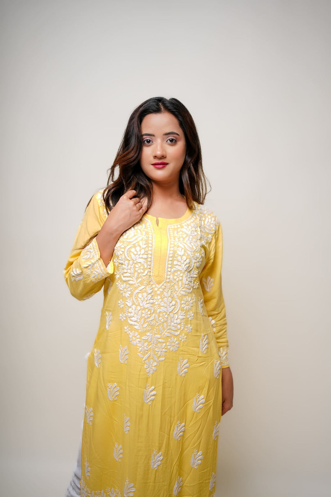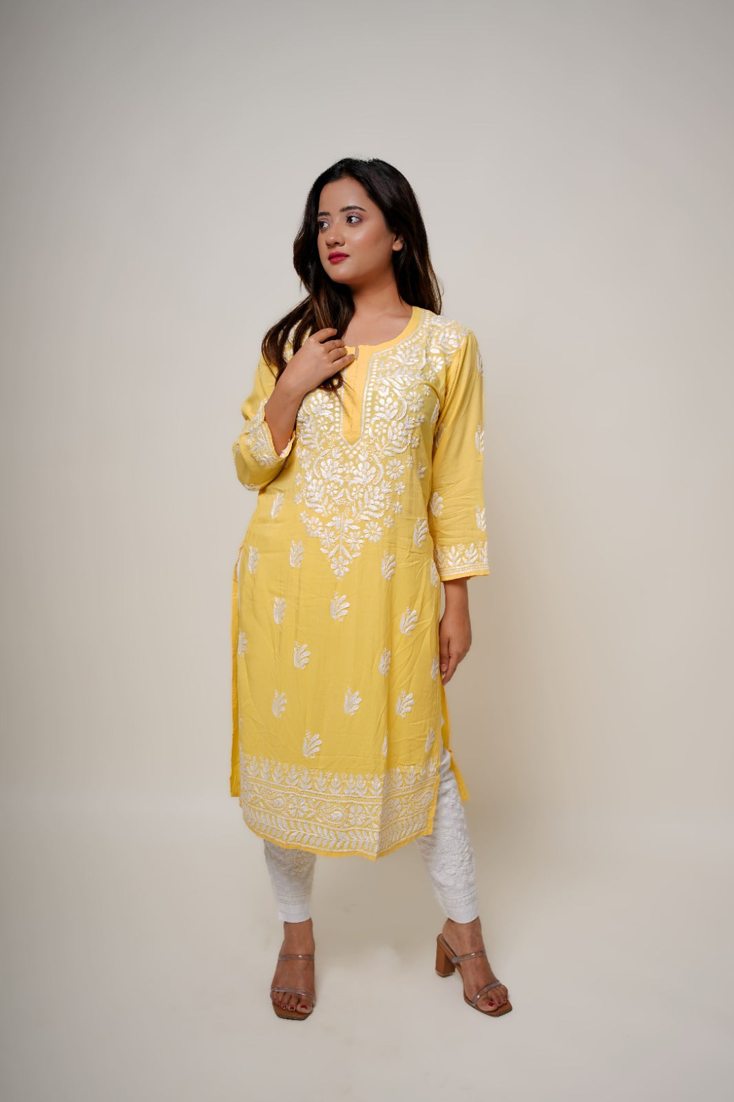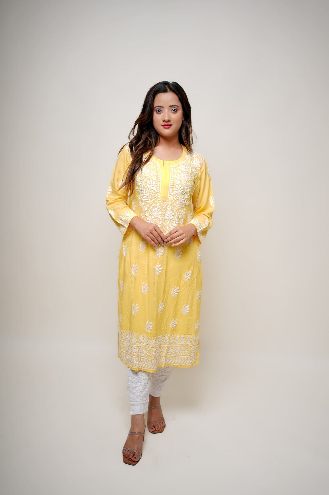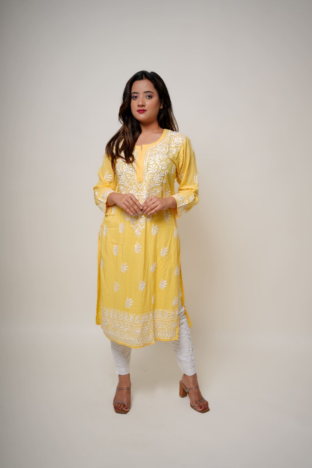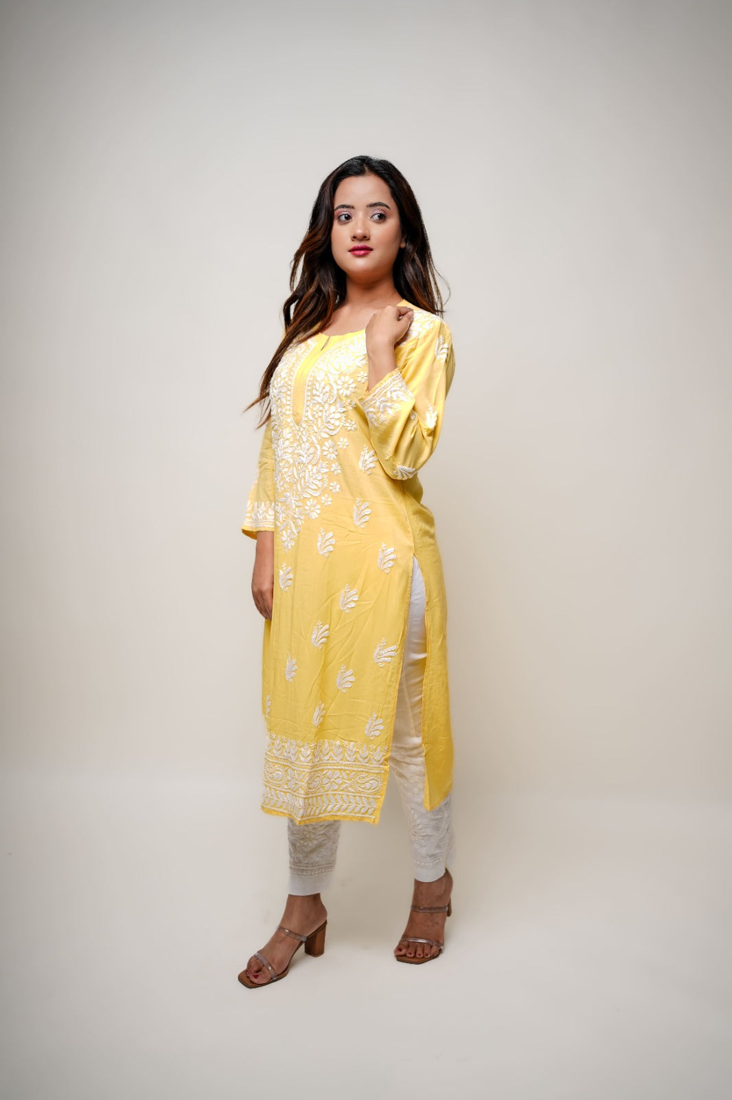 Chikankari hand embroidered | Long Kurta | Mudal | Yellow