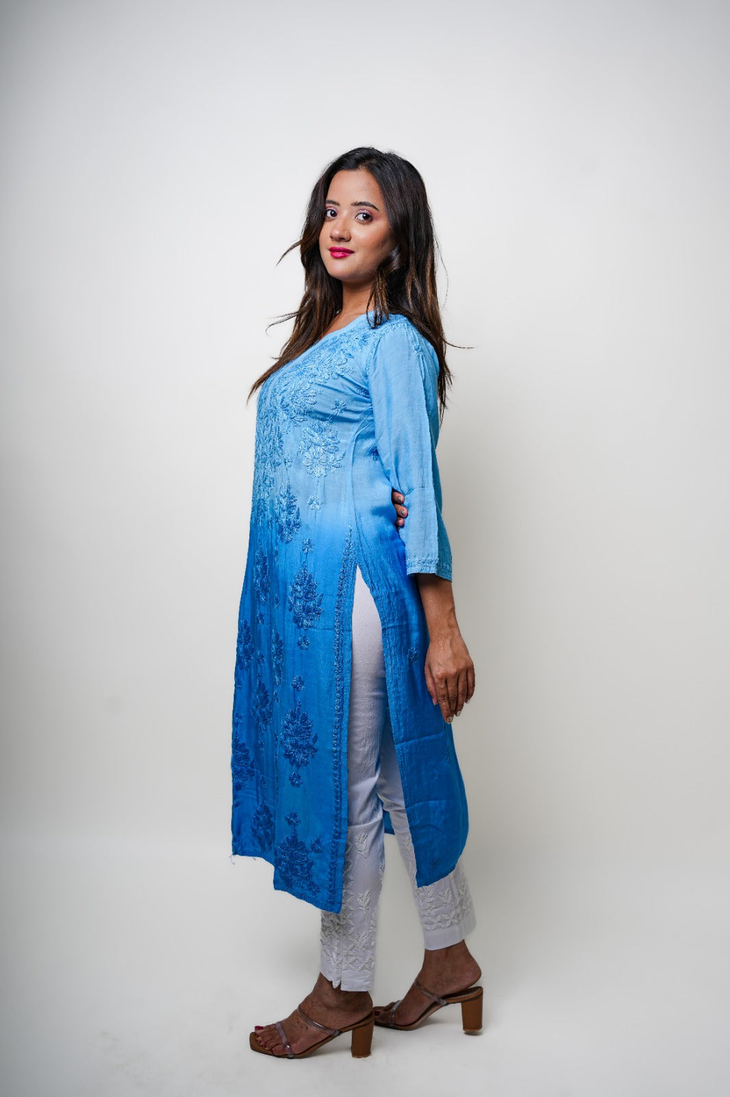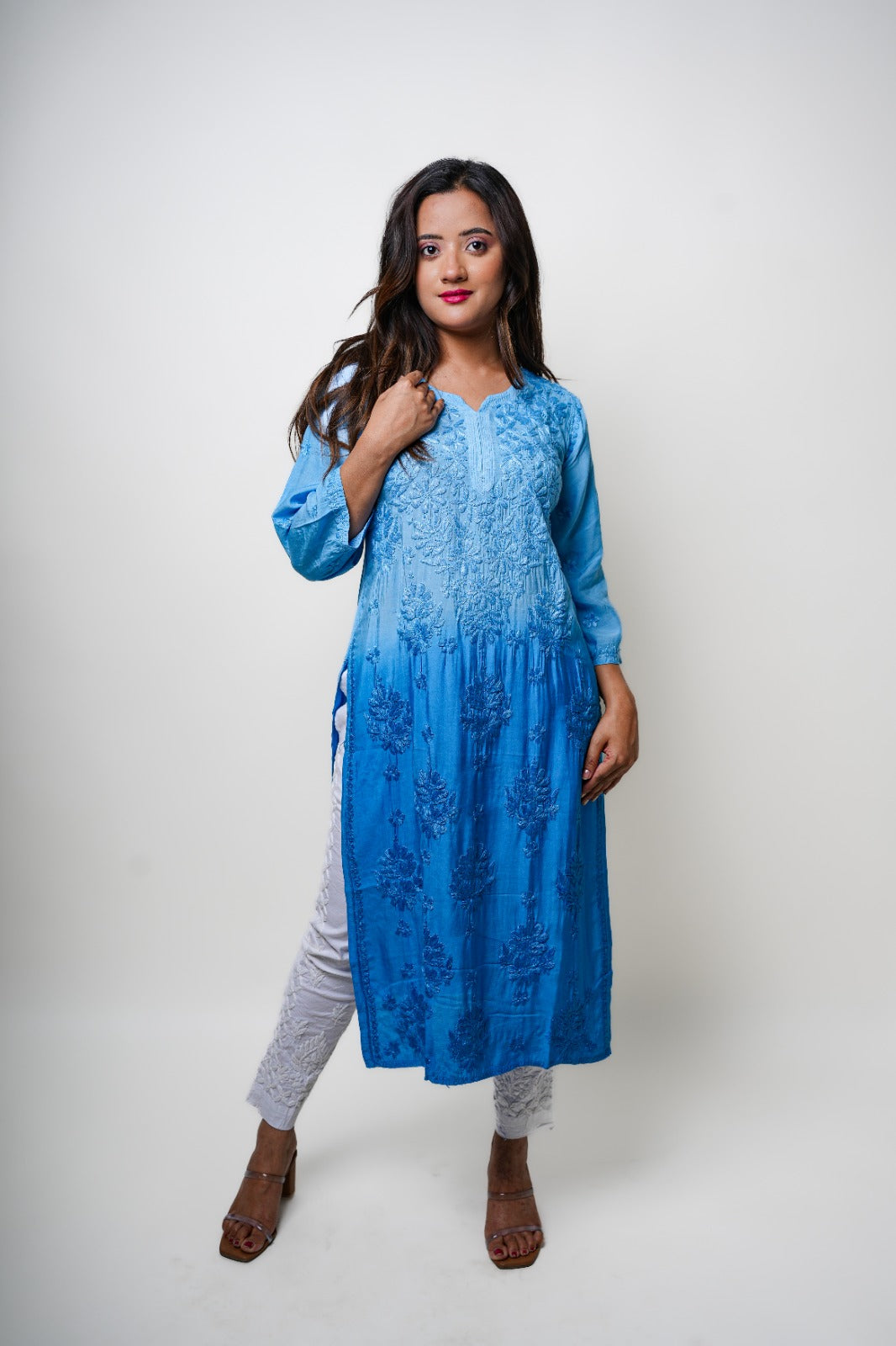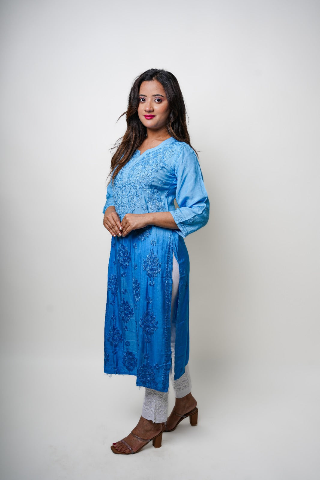 Drape yourself in timeless elegance with this royal blue Chikankari kurta, featuring exquisite tonal embroidery. Designed for festive occasions and statement daywear, this kurta brings together regal hues and handcrafted Lucknowi artistry.
