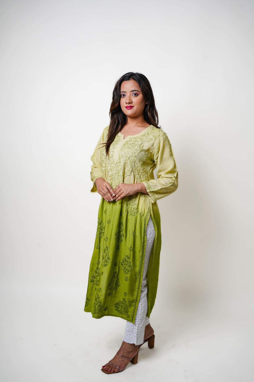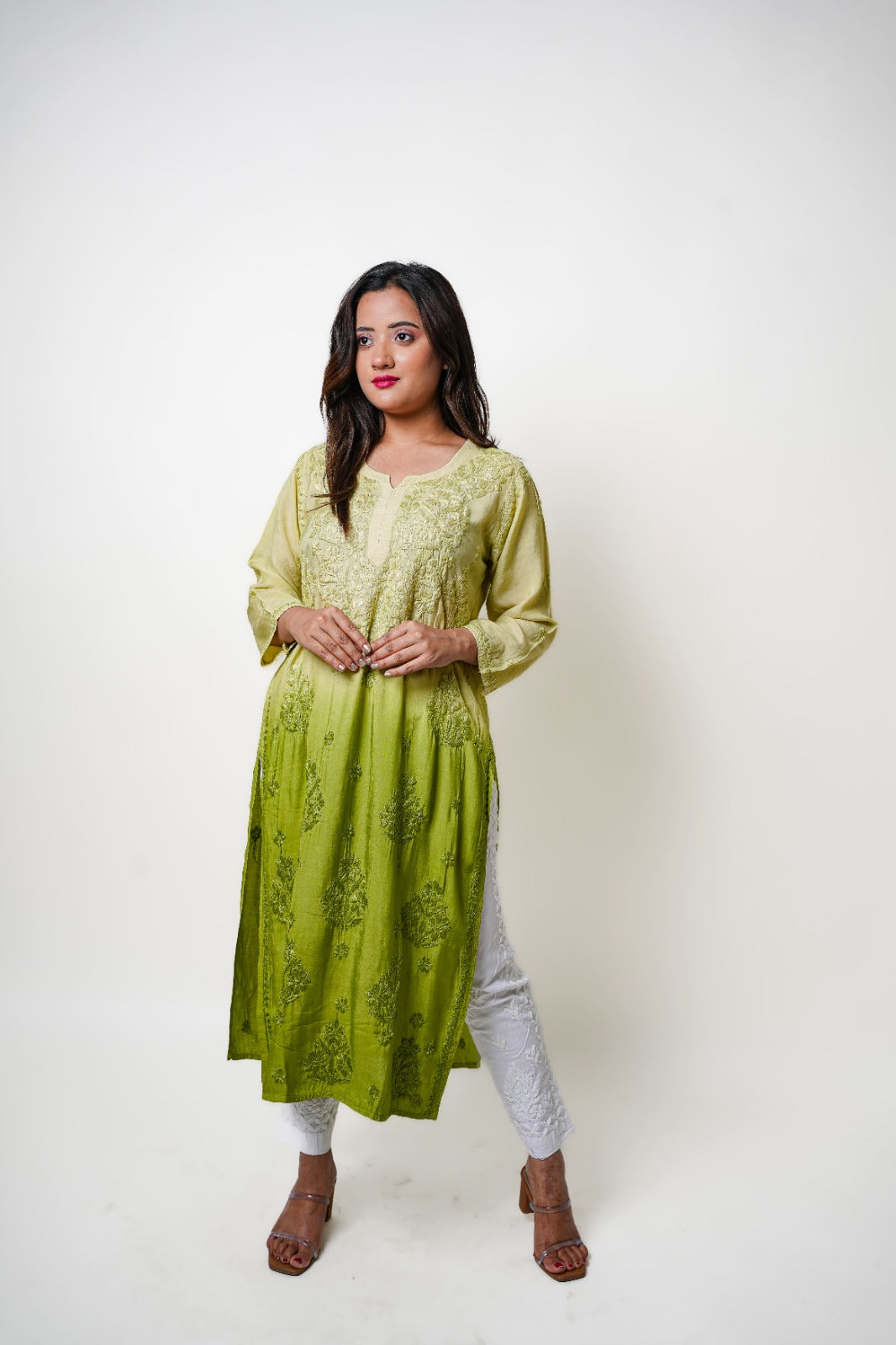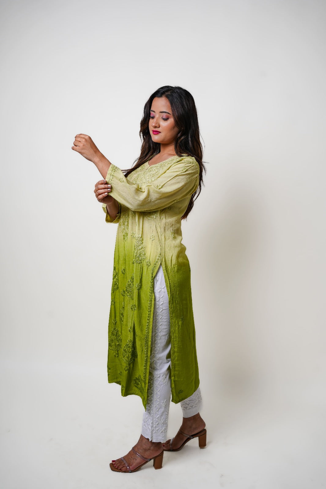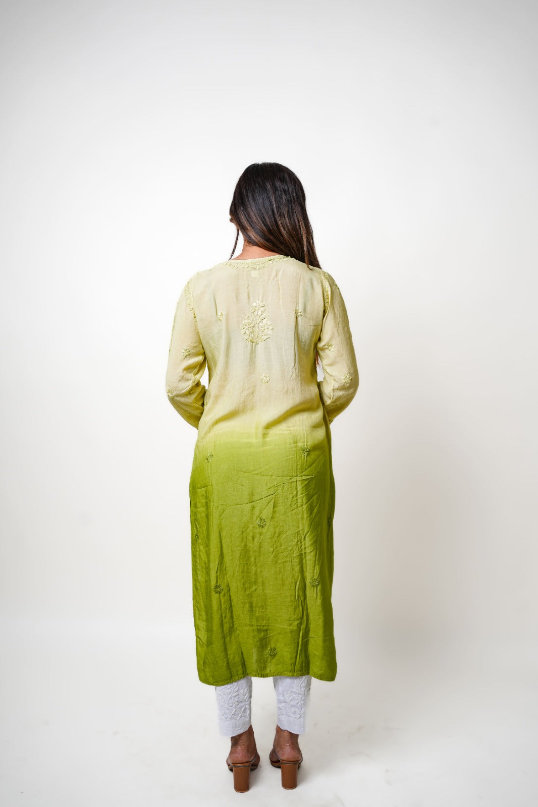 Step into understated glamour with this olive green ombre Chikankari kurta. Perfect for modern minimalists who love a touch of traditional charm in their wardrobe.