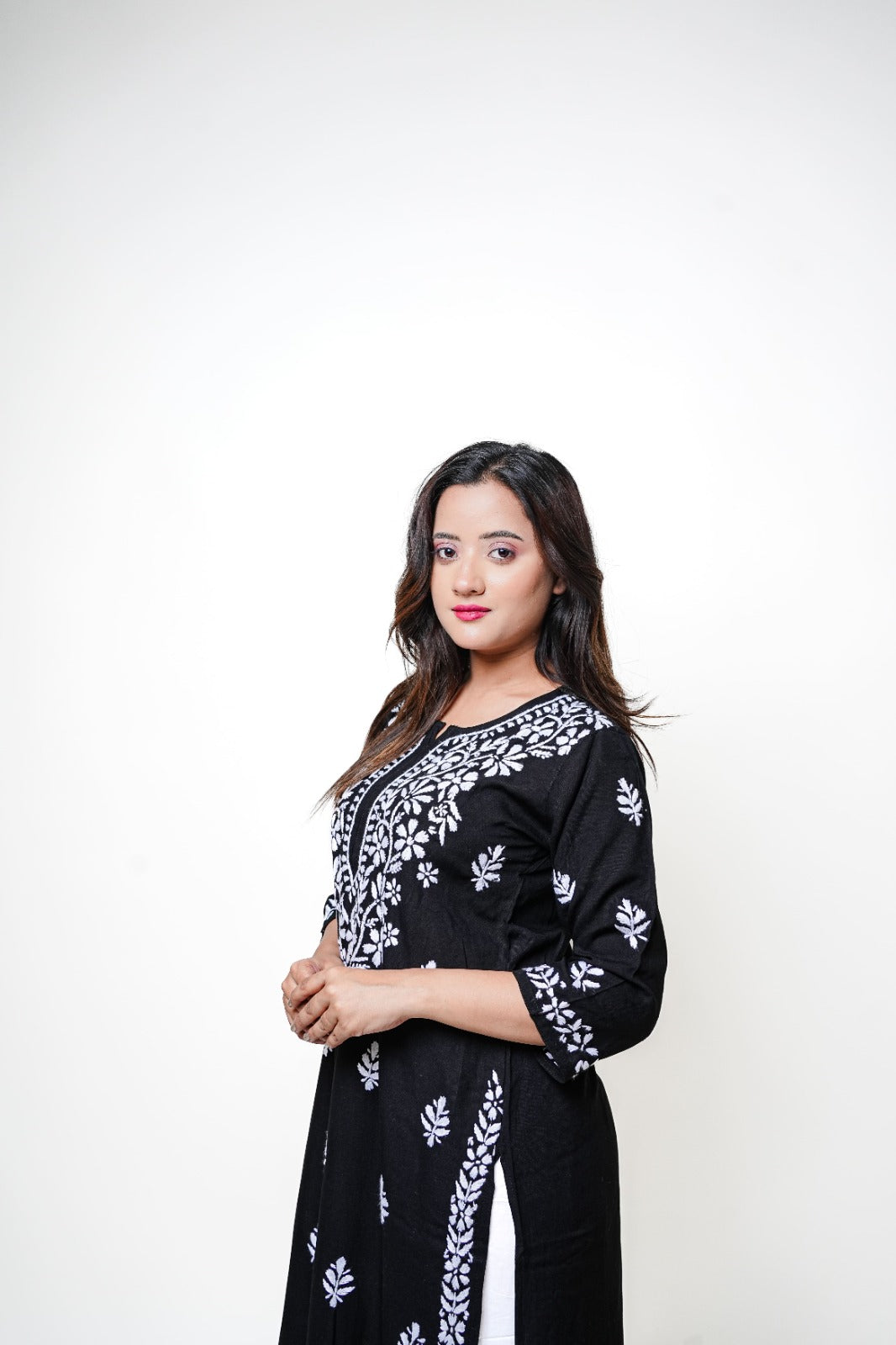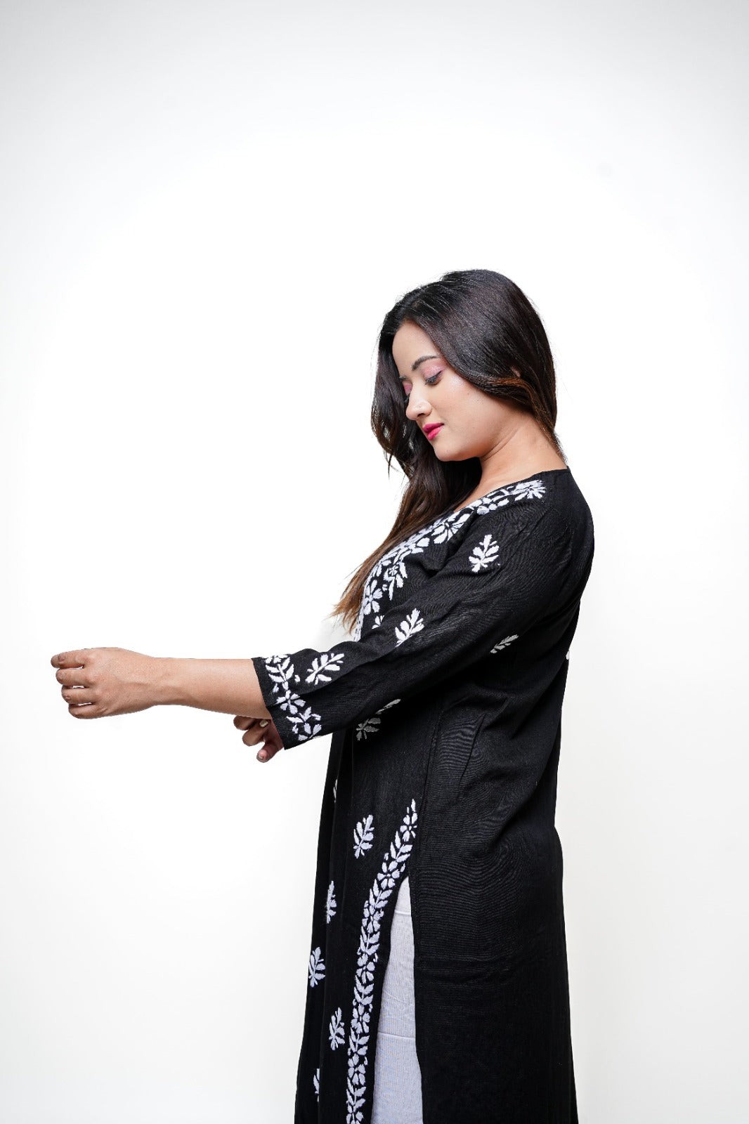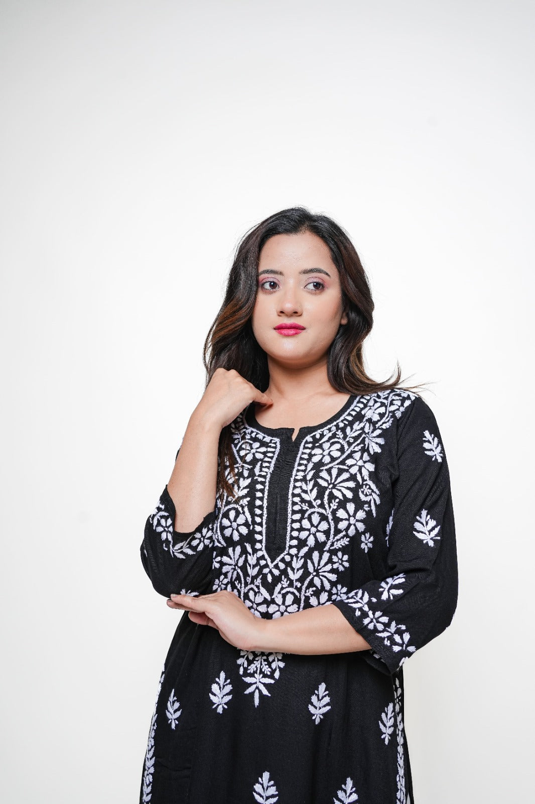 Chikankari hand embroidered | Long Kurta | Rayon | Black