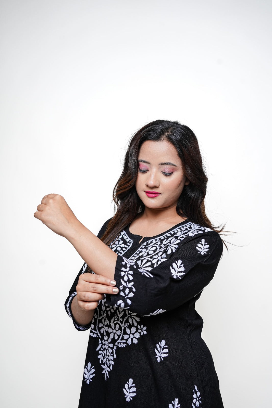 A bold classic — this black hand-embroidered Lucknowi Chikankari kurta is crafted in breathable cotton with intricate white thread motifs. Designed for both statement and comfort, this versatile Chikankari long kurta transitions seamlessly from festive occasions to everyday elegance. Pair it with white bottoms or style it Indo-western — a wardrobe essential for Indian ethnic wear lovers.