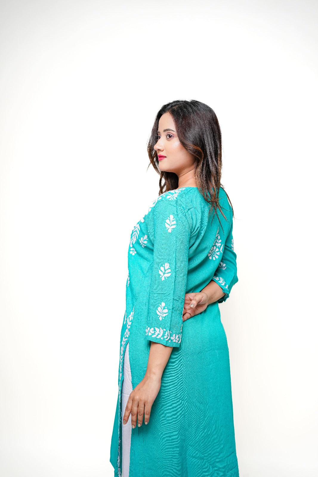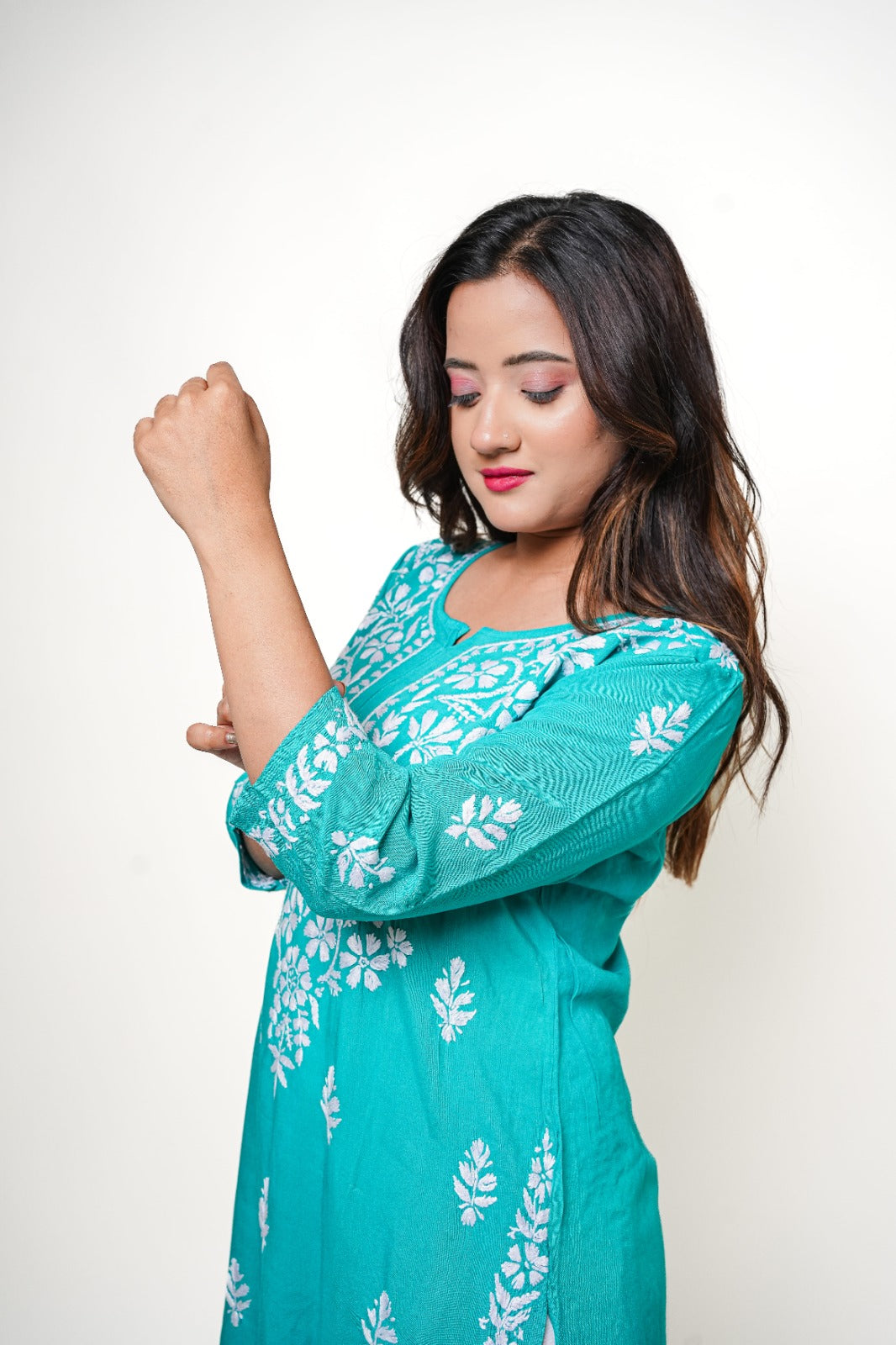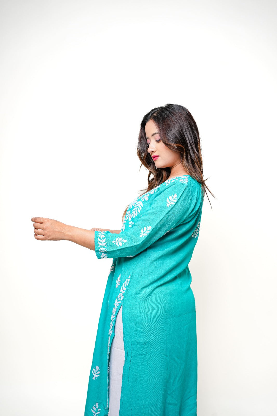 Chikankari hand embroidered | Long Kurta | Rayon | Teal Green