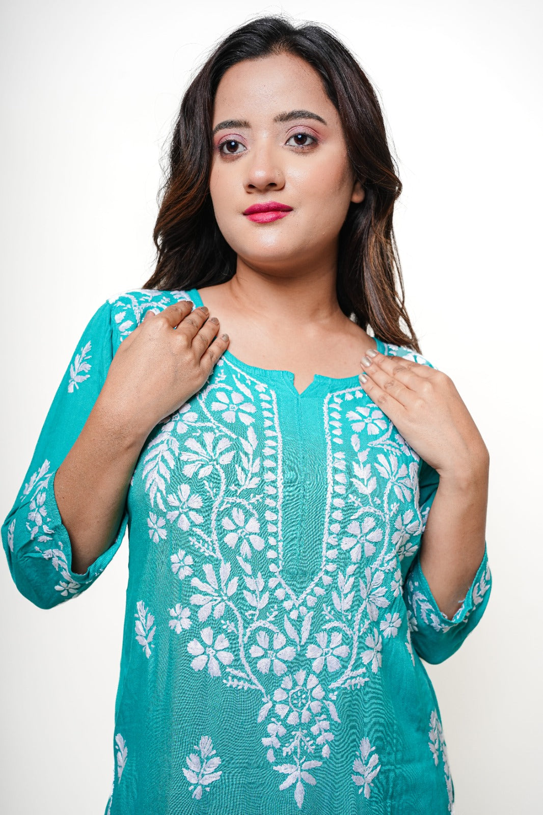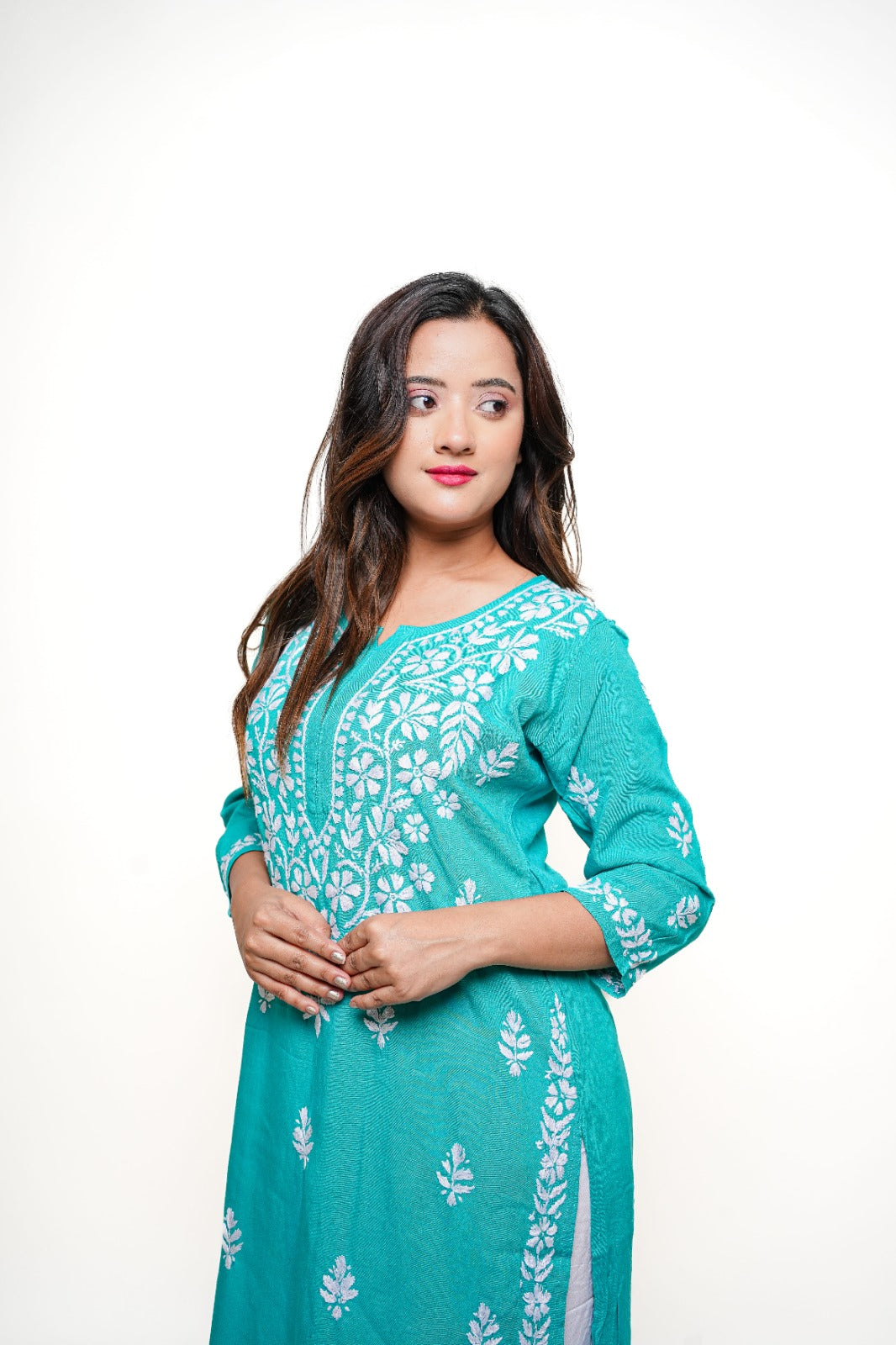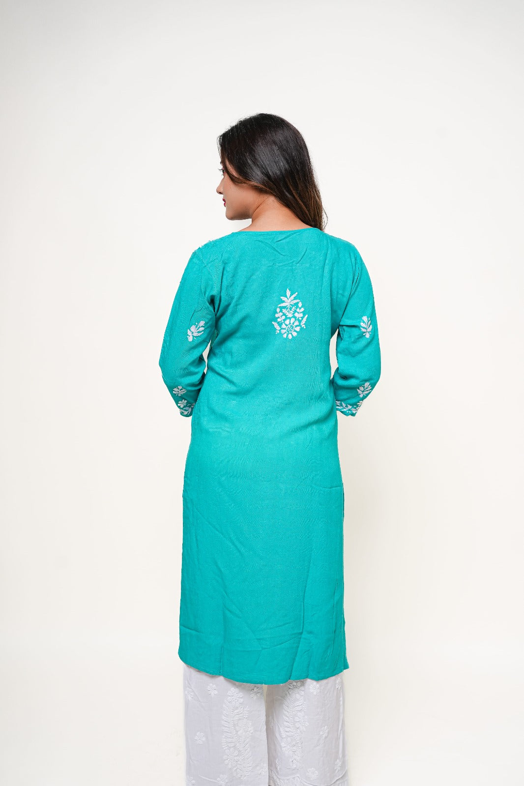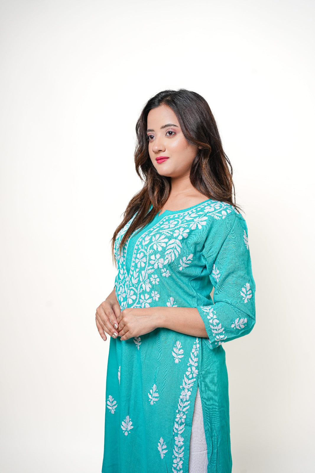 Chikankari hand embroidered | Long Kurta | Rayon | Teal Green