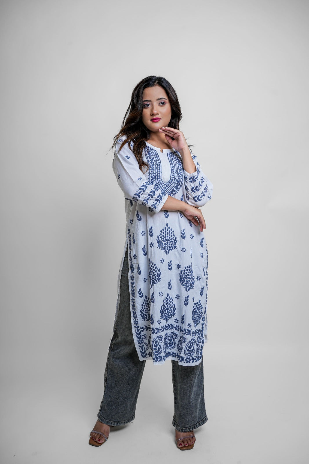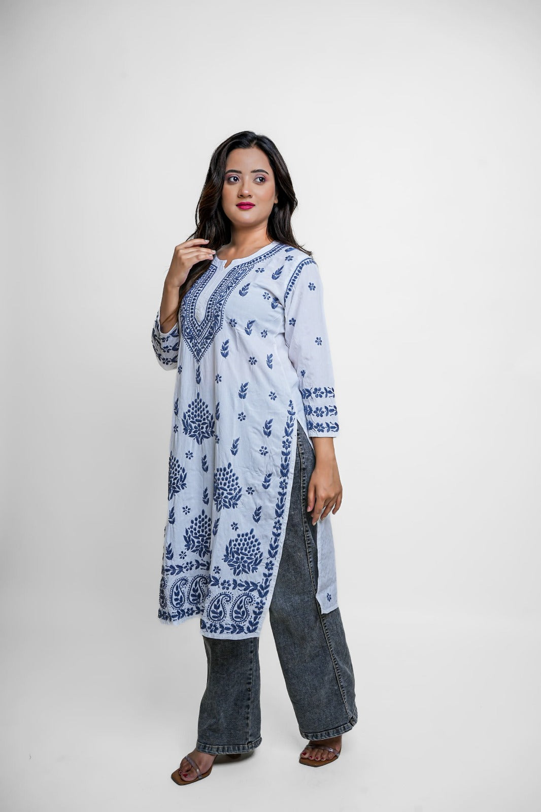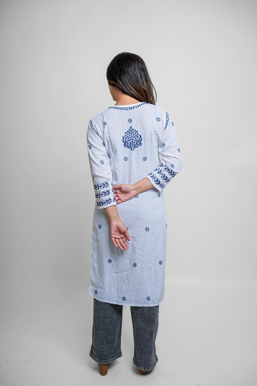 Chikankari hand embroidered | Long Kurta | Rayon | White & Blue
