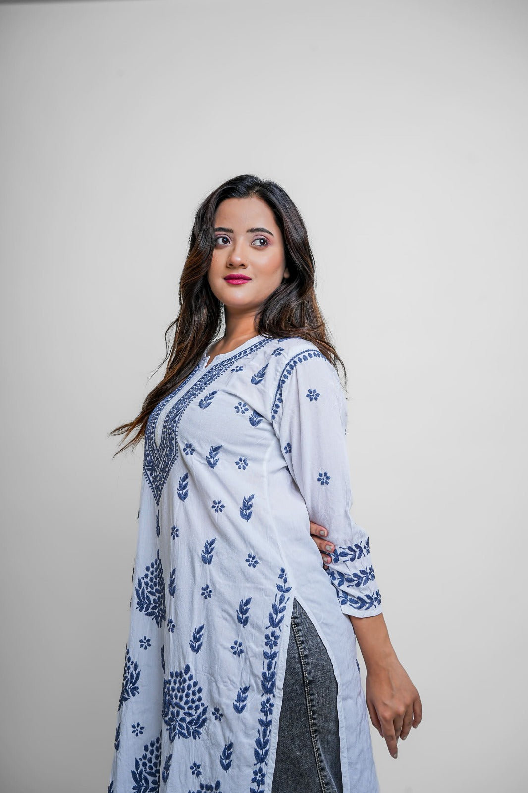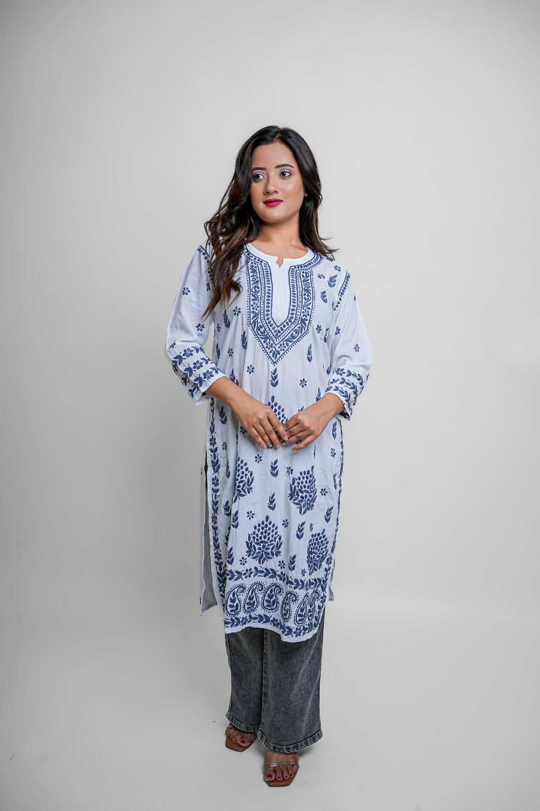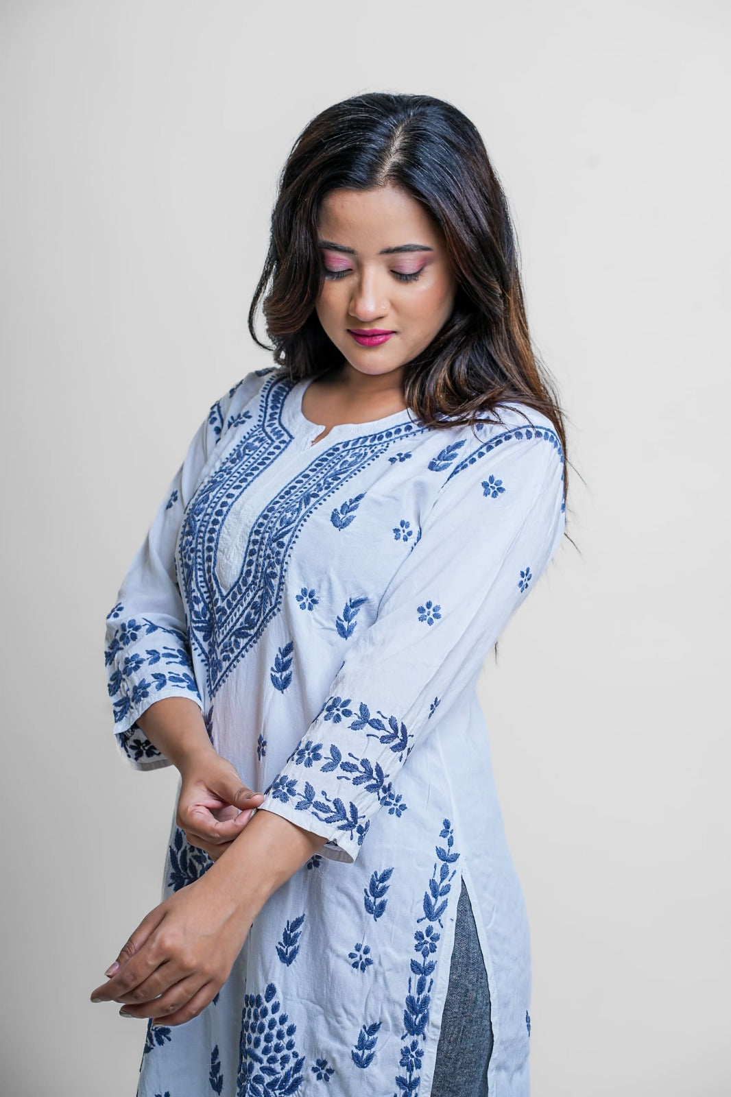 Chikankari hand embroidered | Long Kurta | Rayon | White & Blue