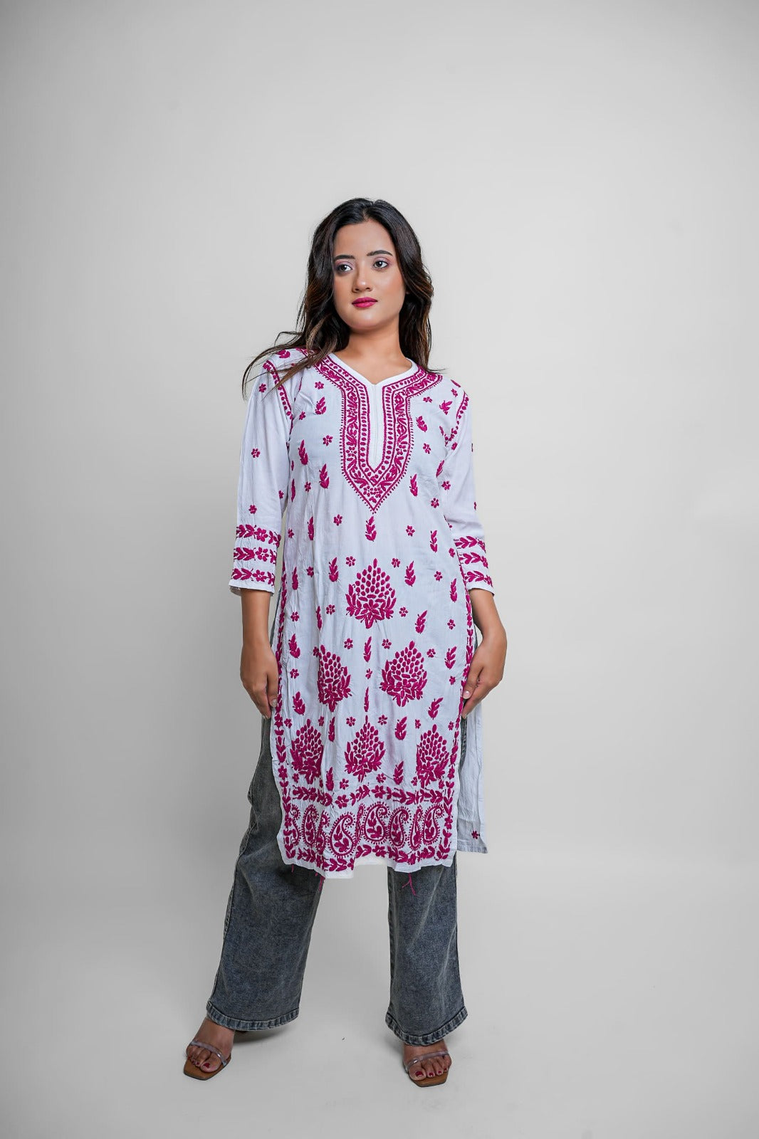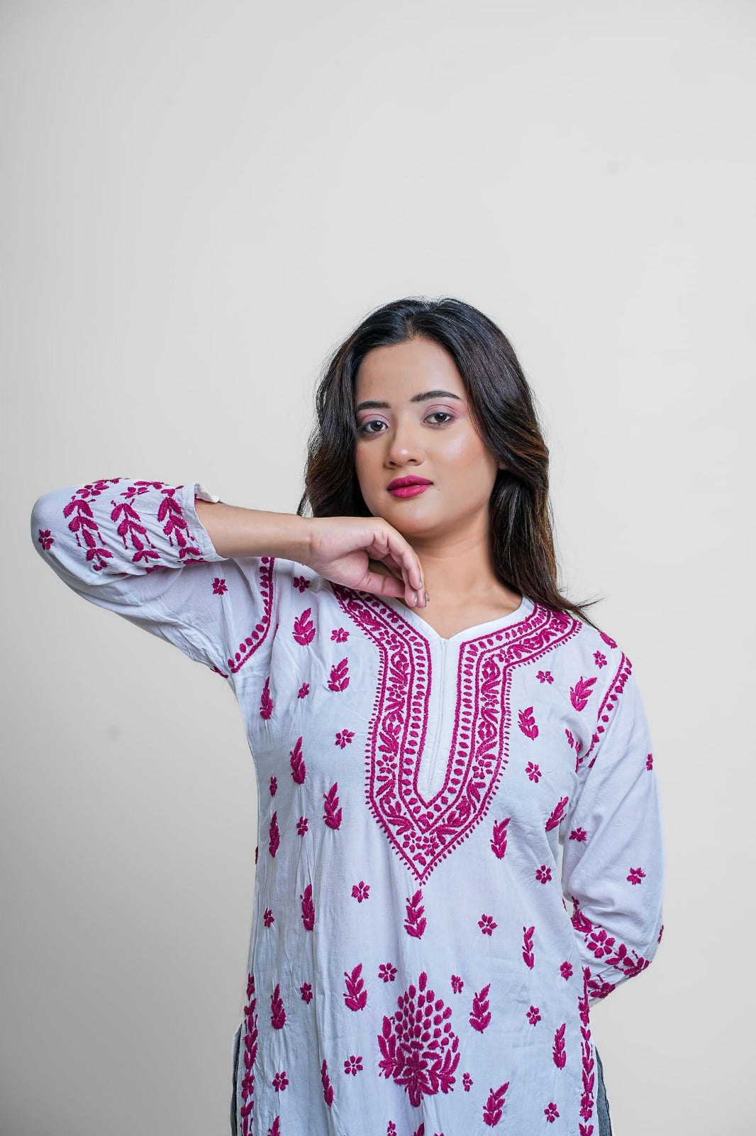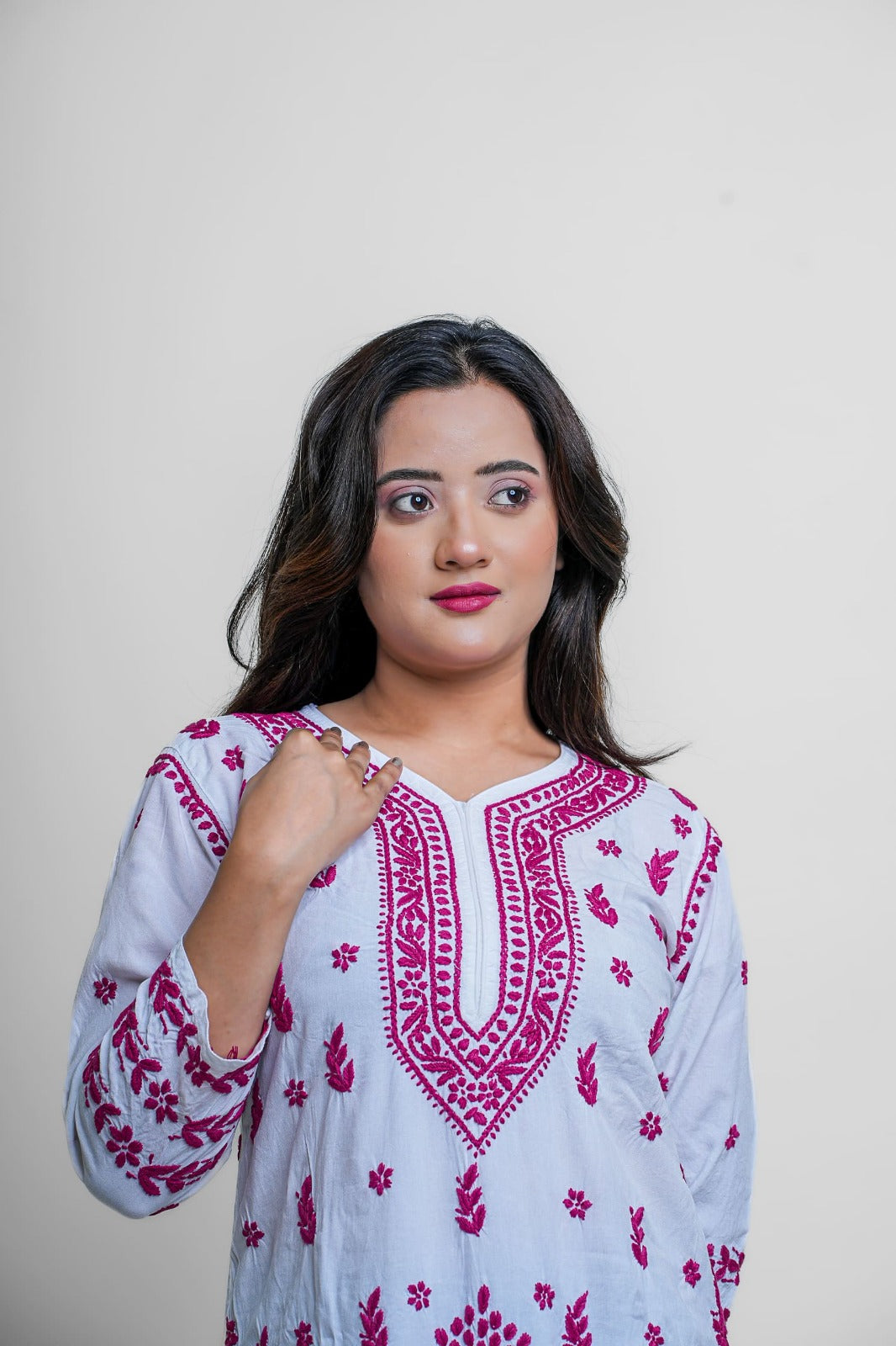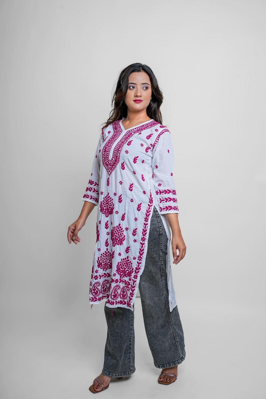 Elevate your ethnic game with this vibrant white and magenta Chikankari kurta. Detailed, bold, and striking — a must-have for festive occasions and statement style.
