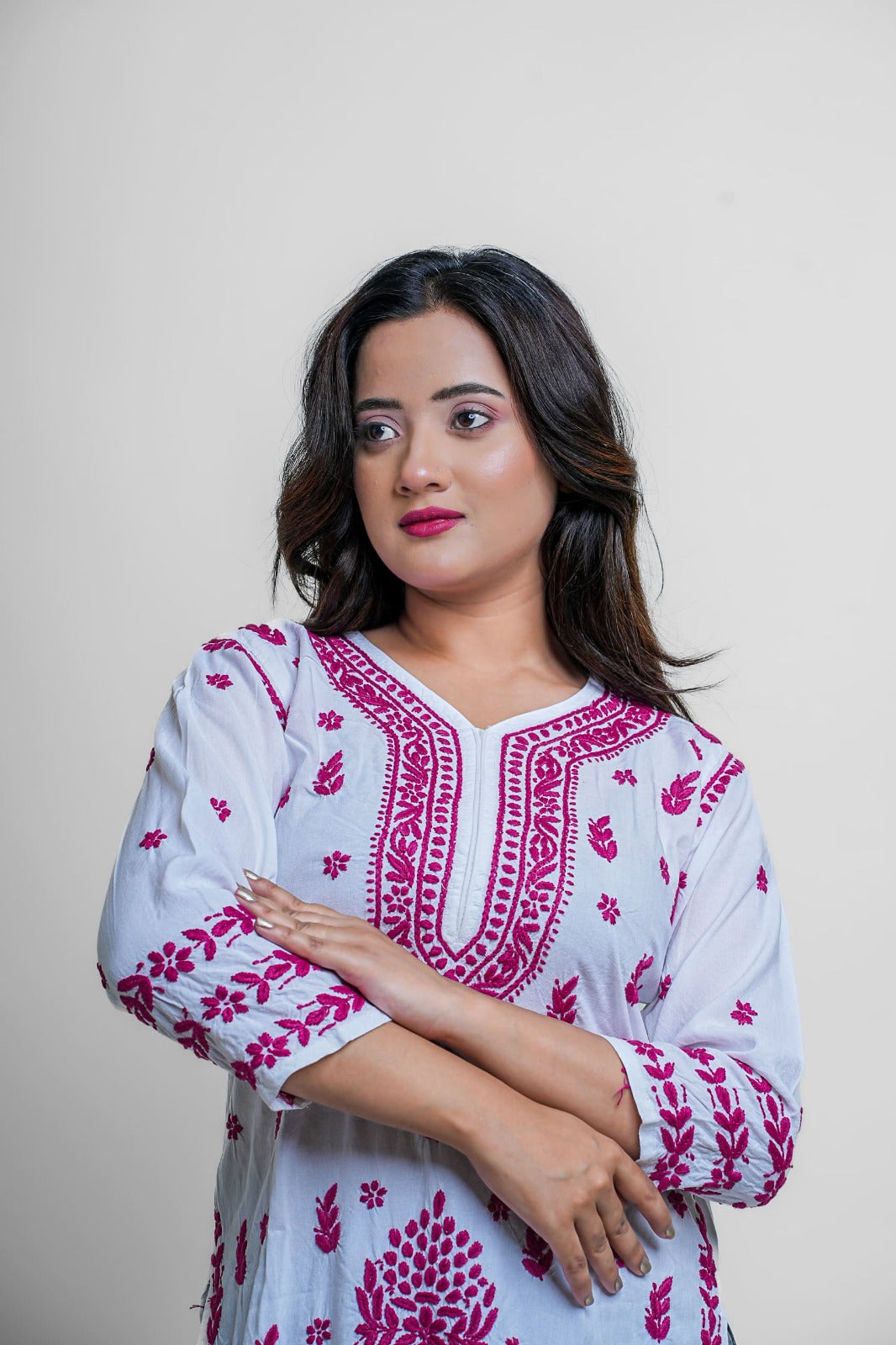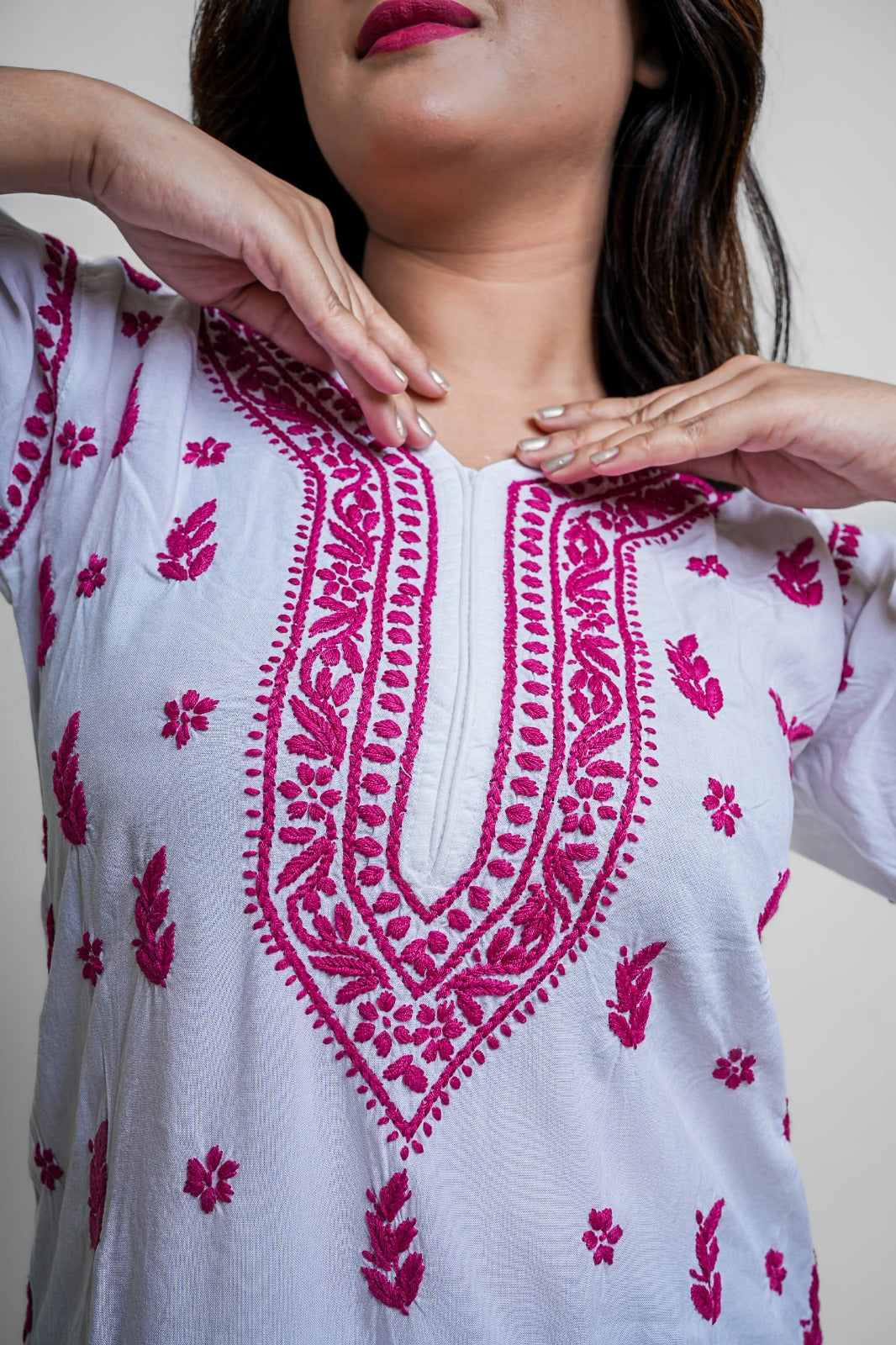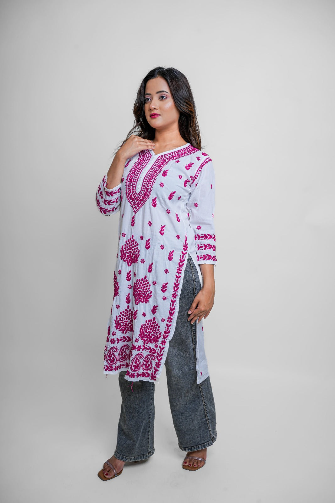Elevate your ethnic game with this vibrant white and magenta Chikankari kurta. Detailed, bold, and striking — a must-have for festive occasions and statement style.