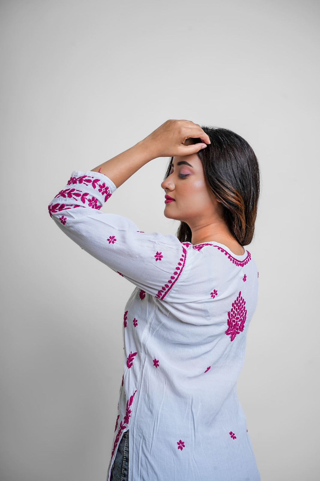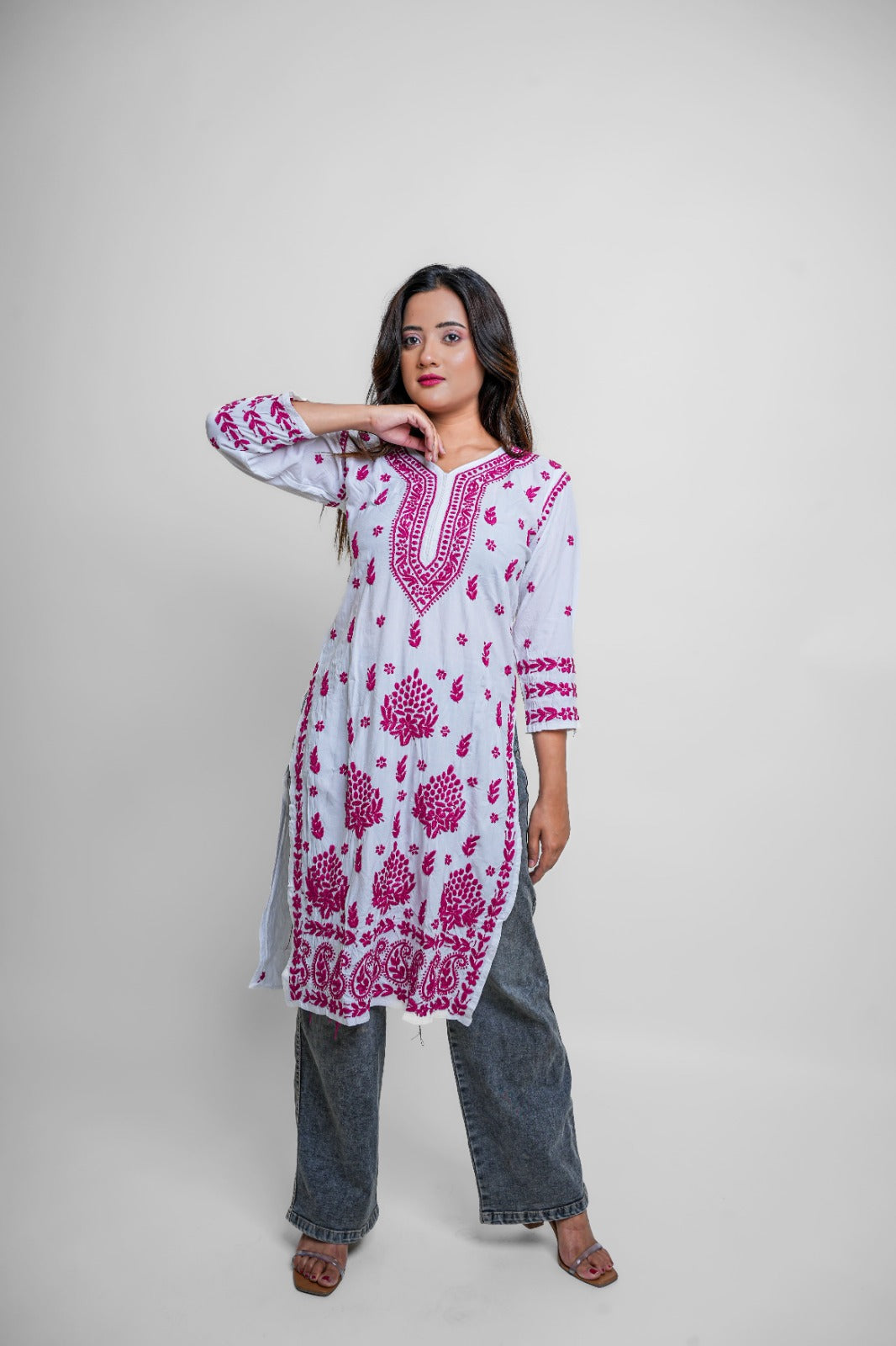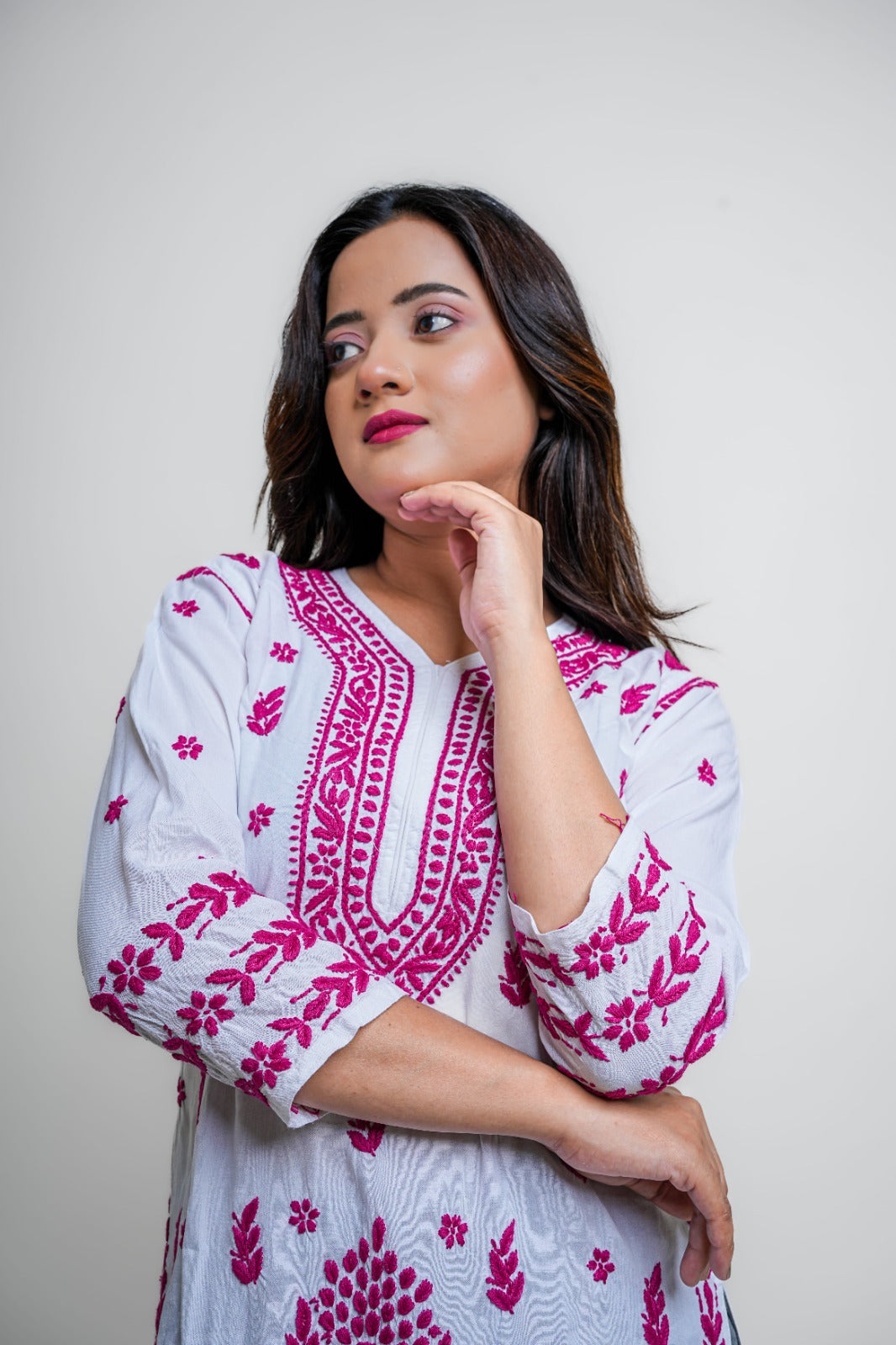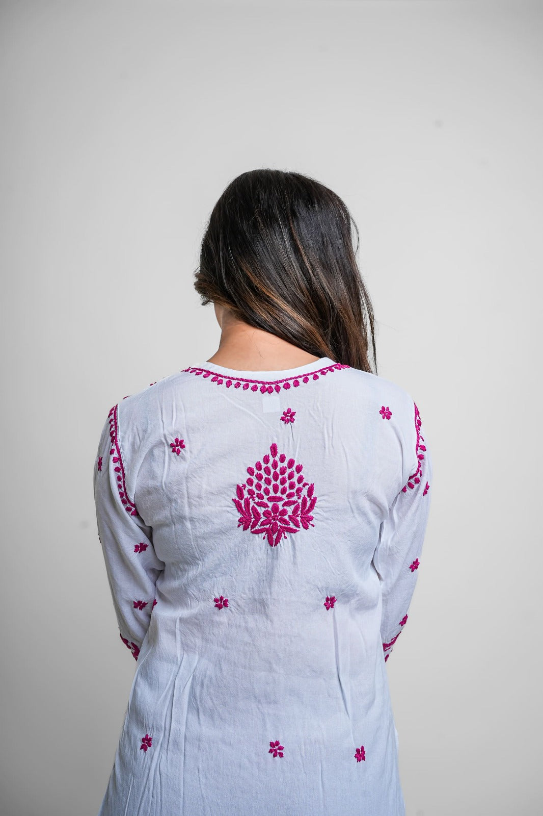 Elevate your ethnic game with this vibrant white and magenta Chikankari kurta. Detailed, bold, and striking — a must-have for festive occasions and statement style.