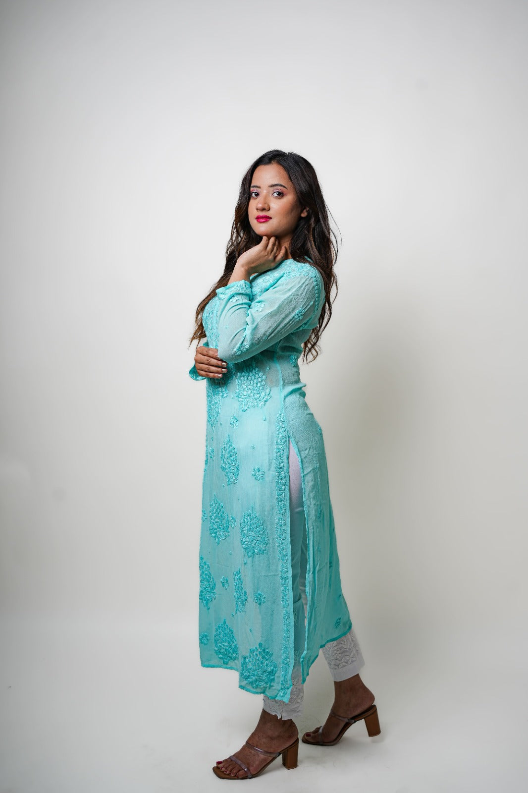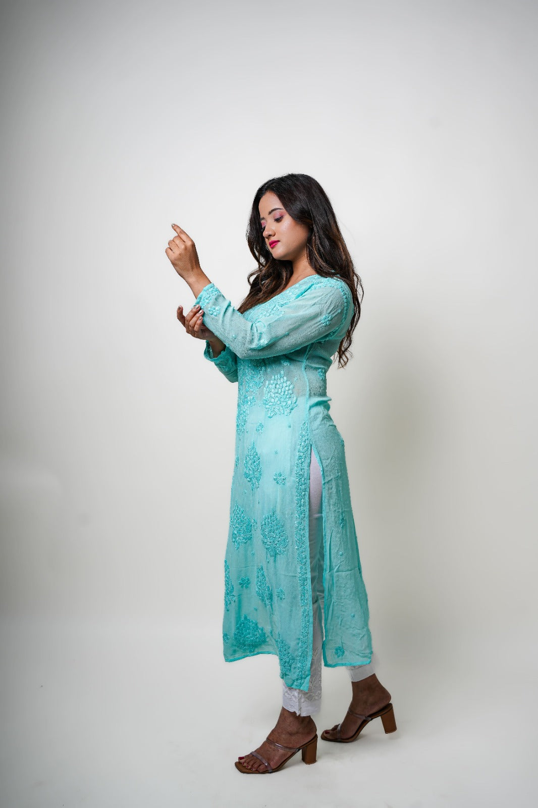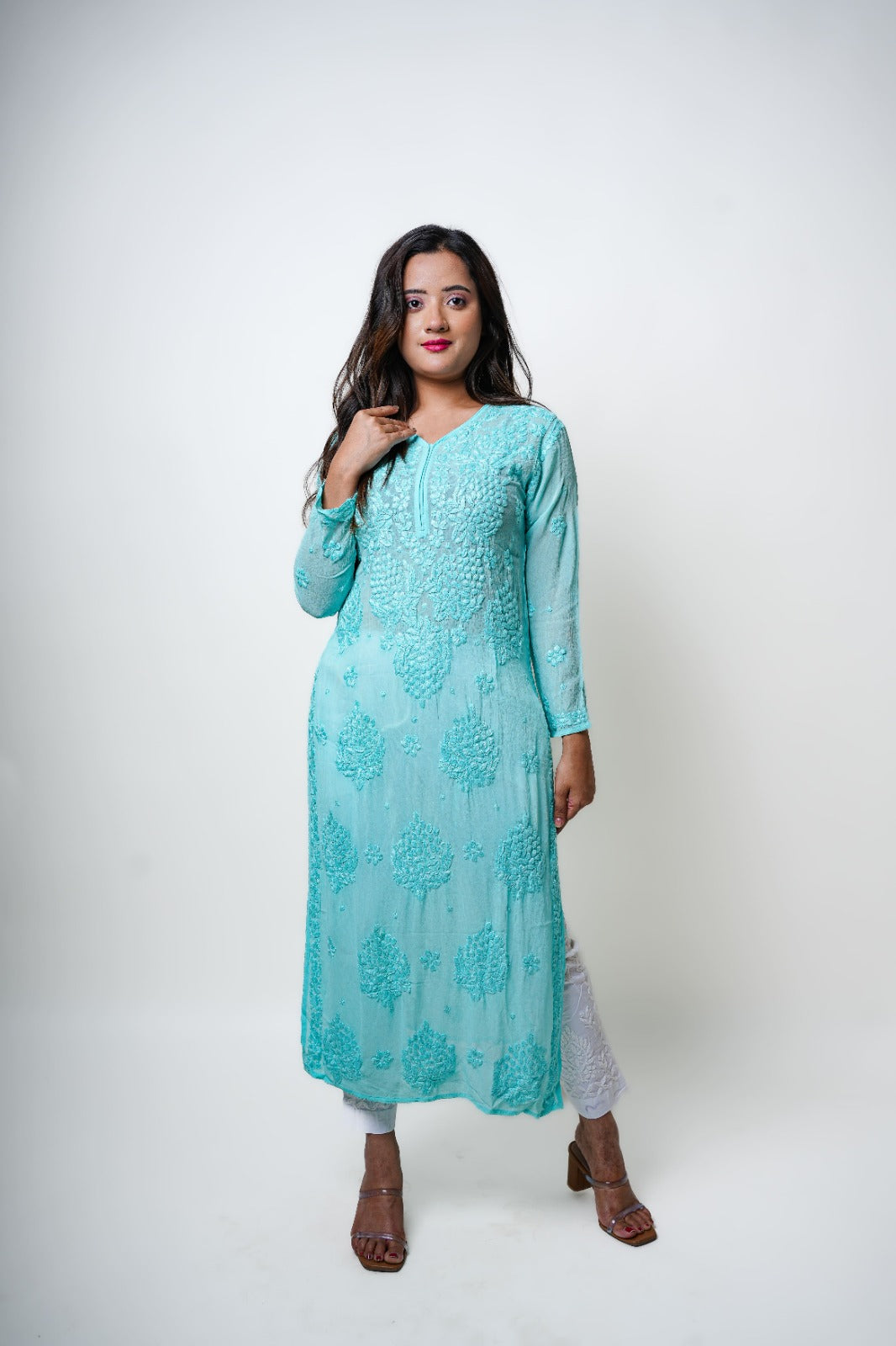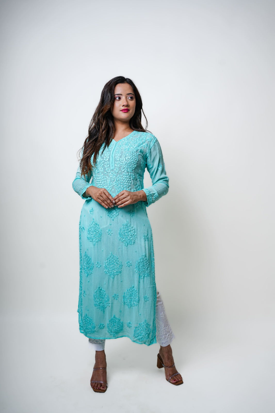 Chikankari hand embroidered | Long Kurta | Viscose | Sea green