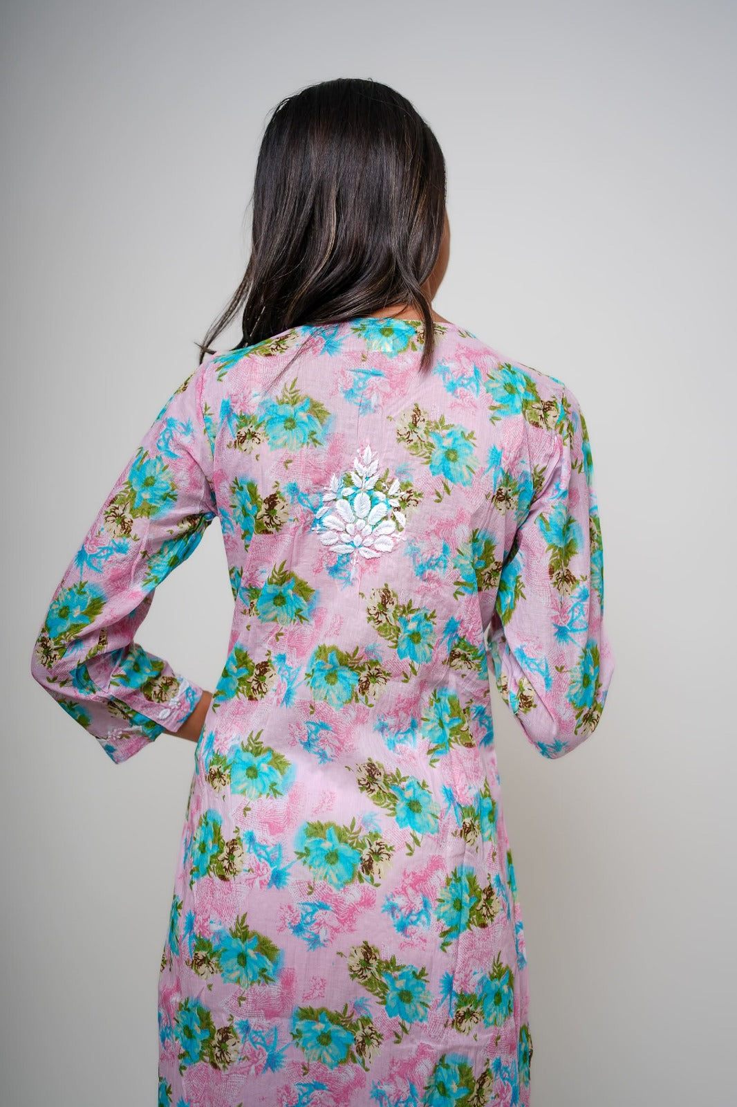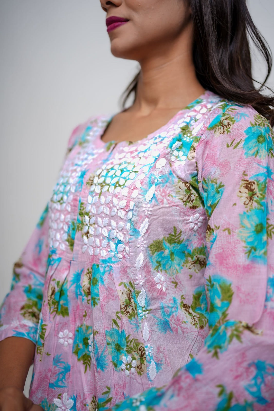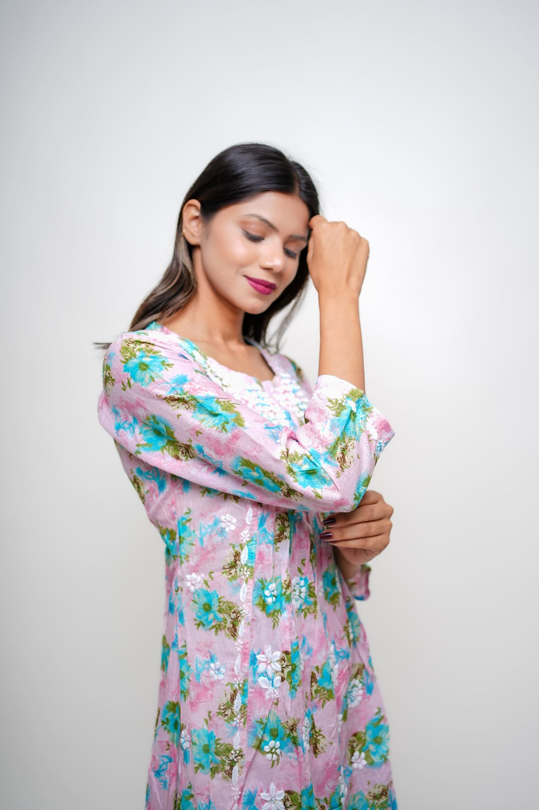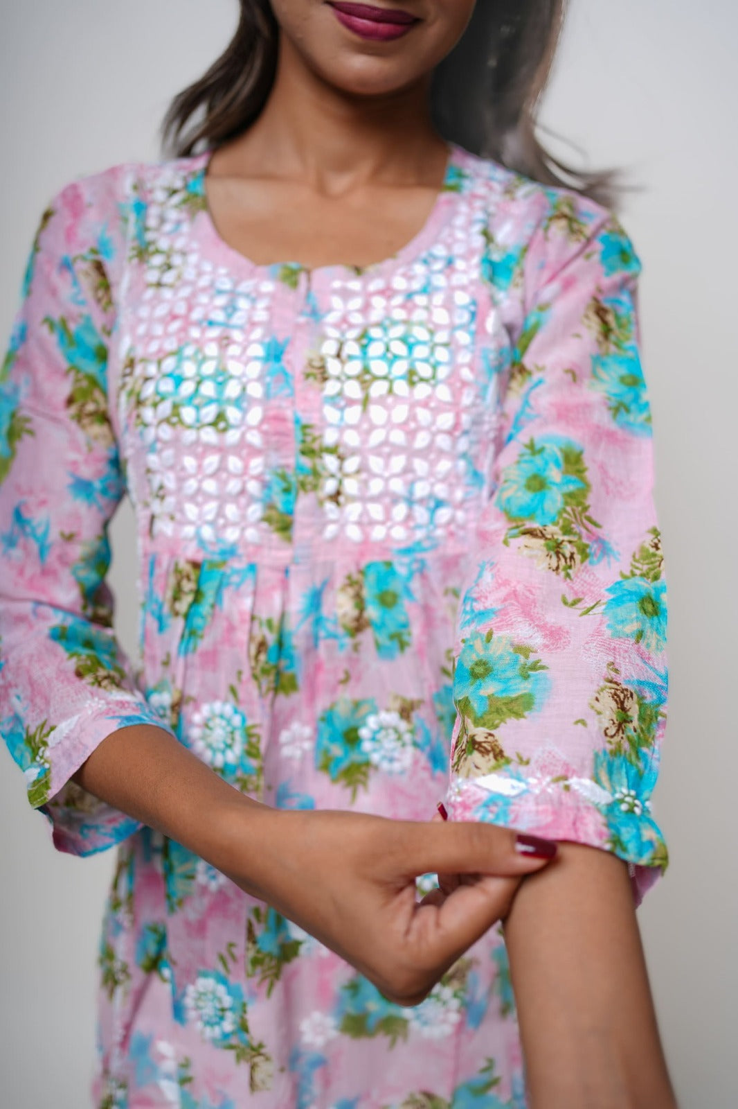 This pink floral Chikankari short kurta is where delicate craftsmanship meets playful elegance. Featuring vivid blue and white embroidery on soft pink fabric, this kurta is an ode to the timeless art of handmade Chikankari. Wear it with whites or denims for a chic Indo-western twist — perfect for festive days, casual gatherings, or elevated everyday style.
