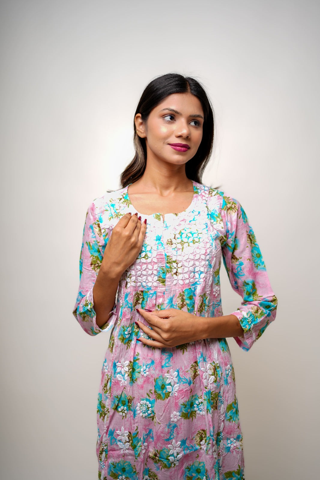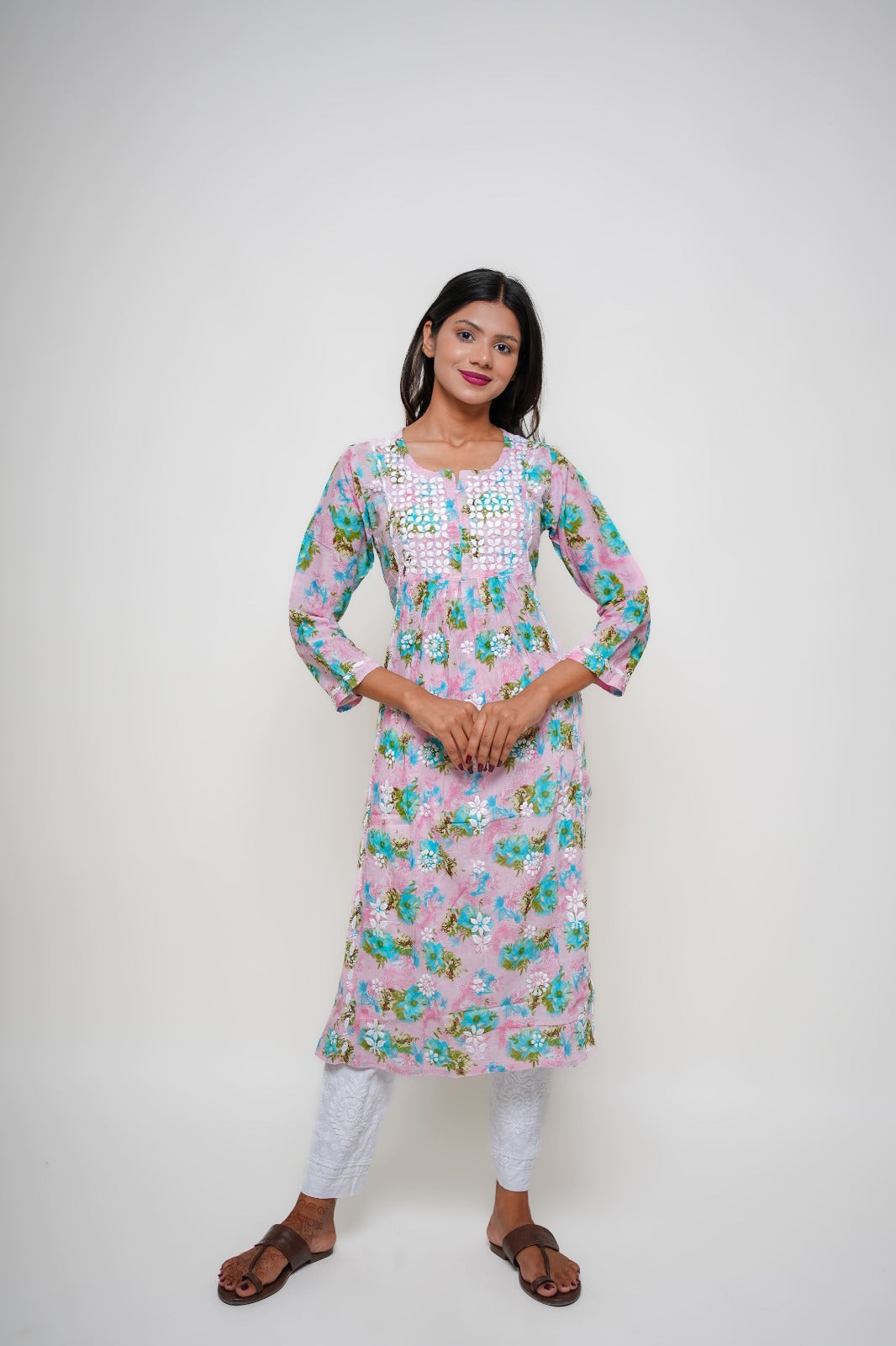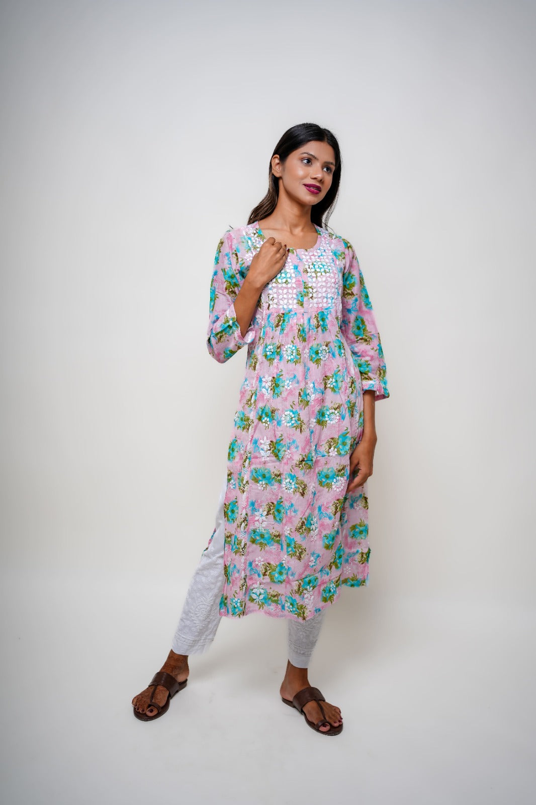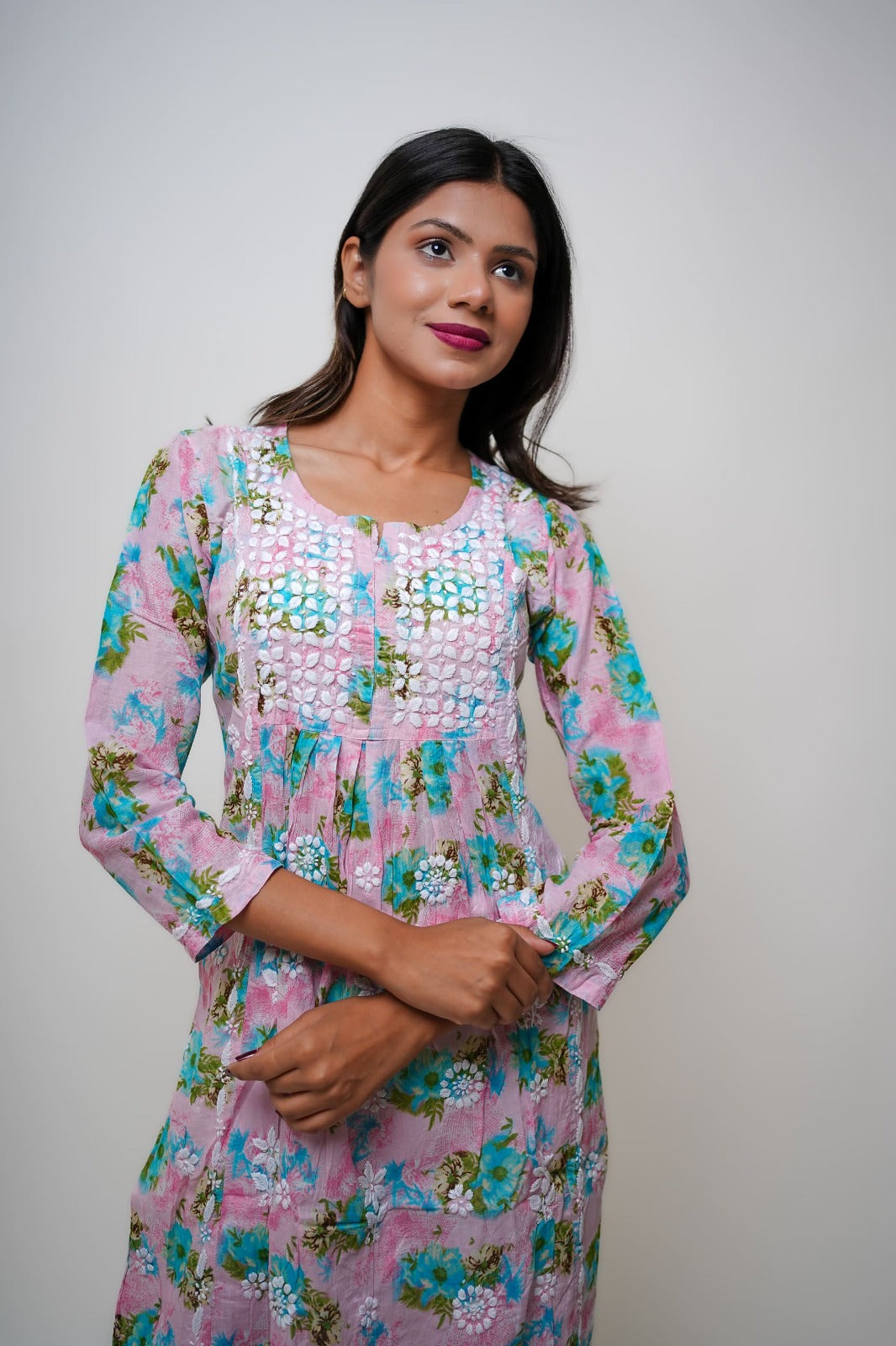 This pink floral Chikankari short kurta is where delicate craftsmanship meets playful elegance. Featuring vivid blue and white embroidery on soft pink fabric, this kurta is an ode to the timeless art of handmade Chikankari. Wear it with whites or denims for a chic Indo-western twist — perfect for festive days, casual gatherings, or elevated everyday style.