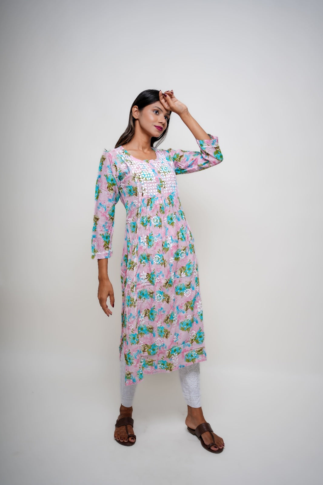 Chikankari hand embroidered | Long Nayra | Mul cotton | Pink