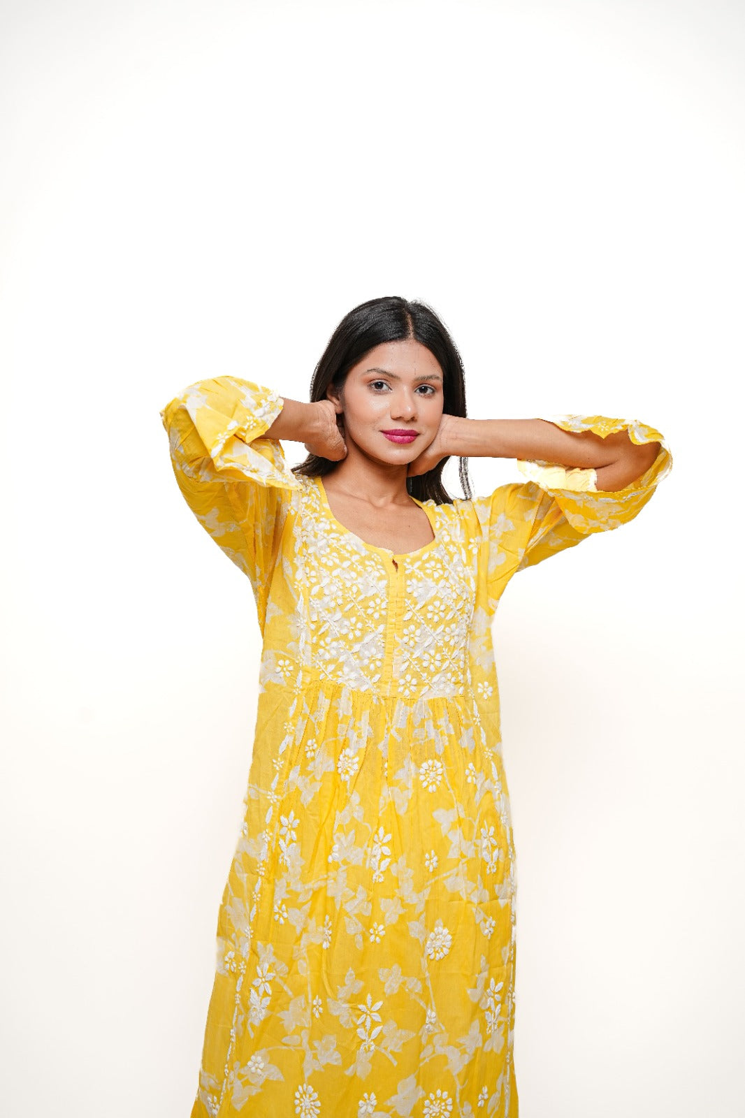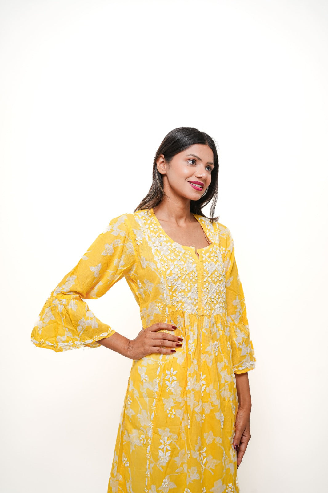 Chikankari hand embroidered | Long Nayra | Mul cotton | Yellow