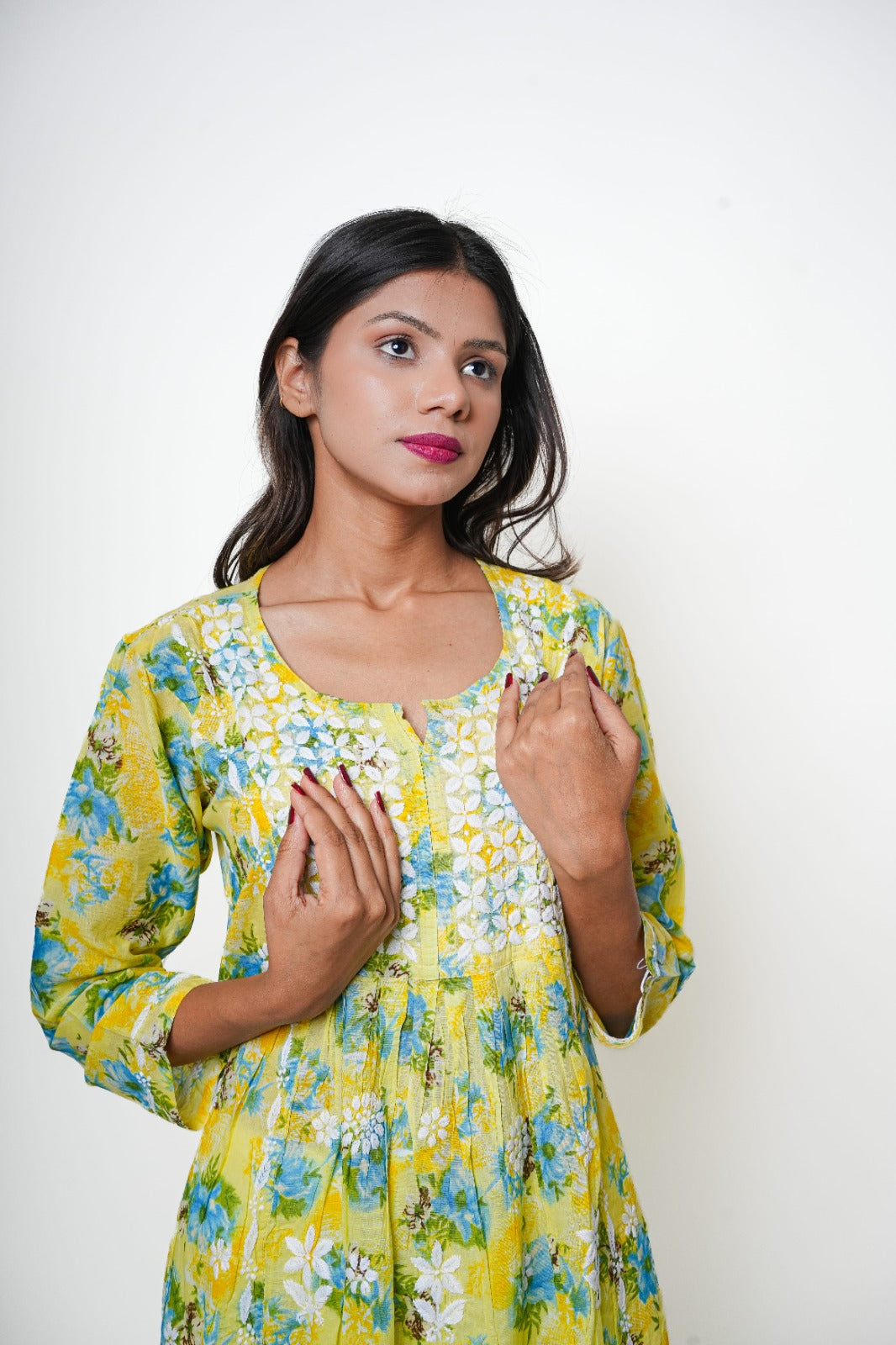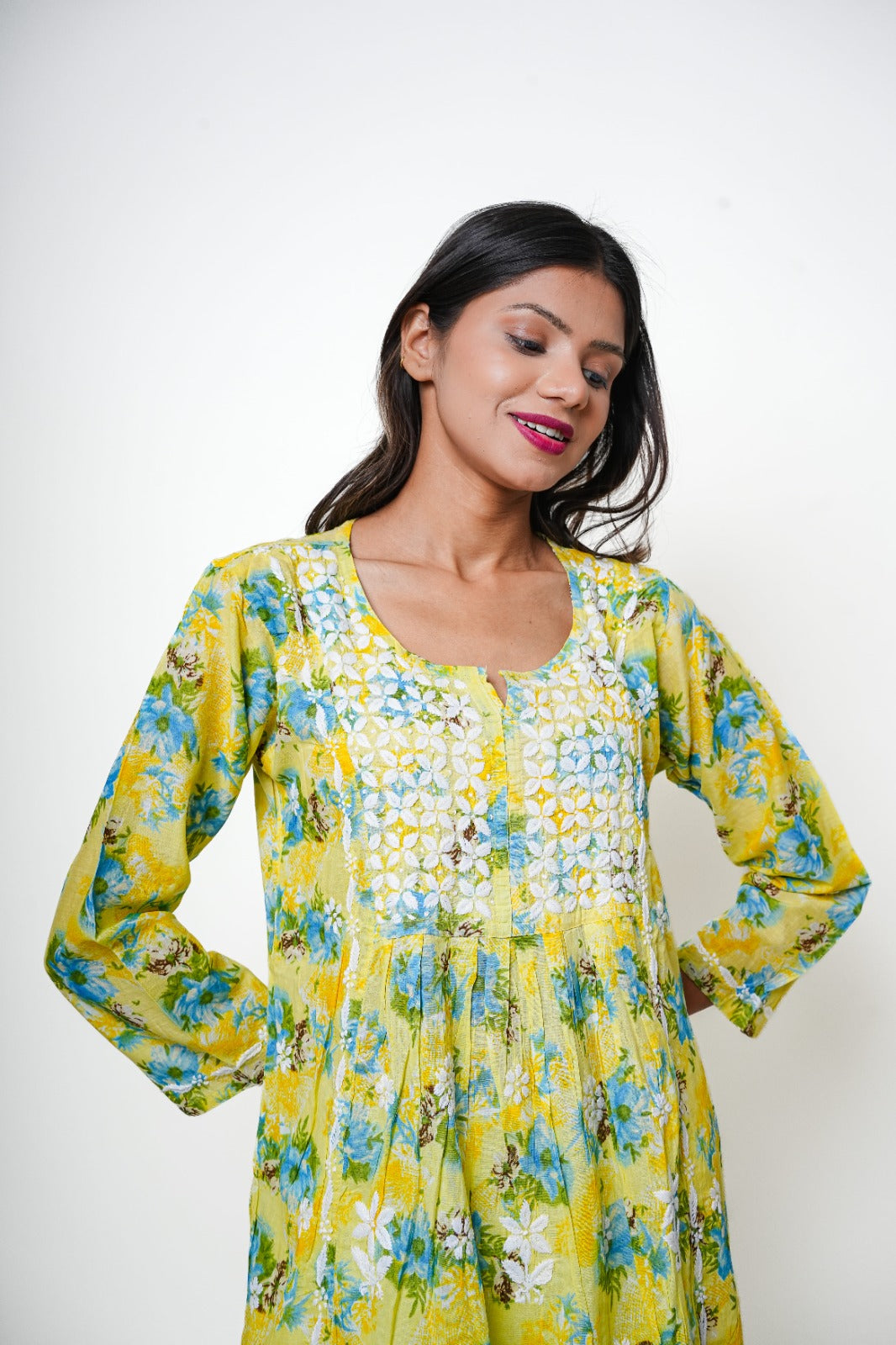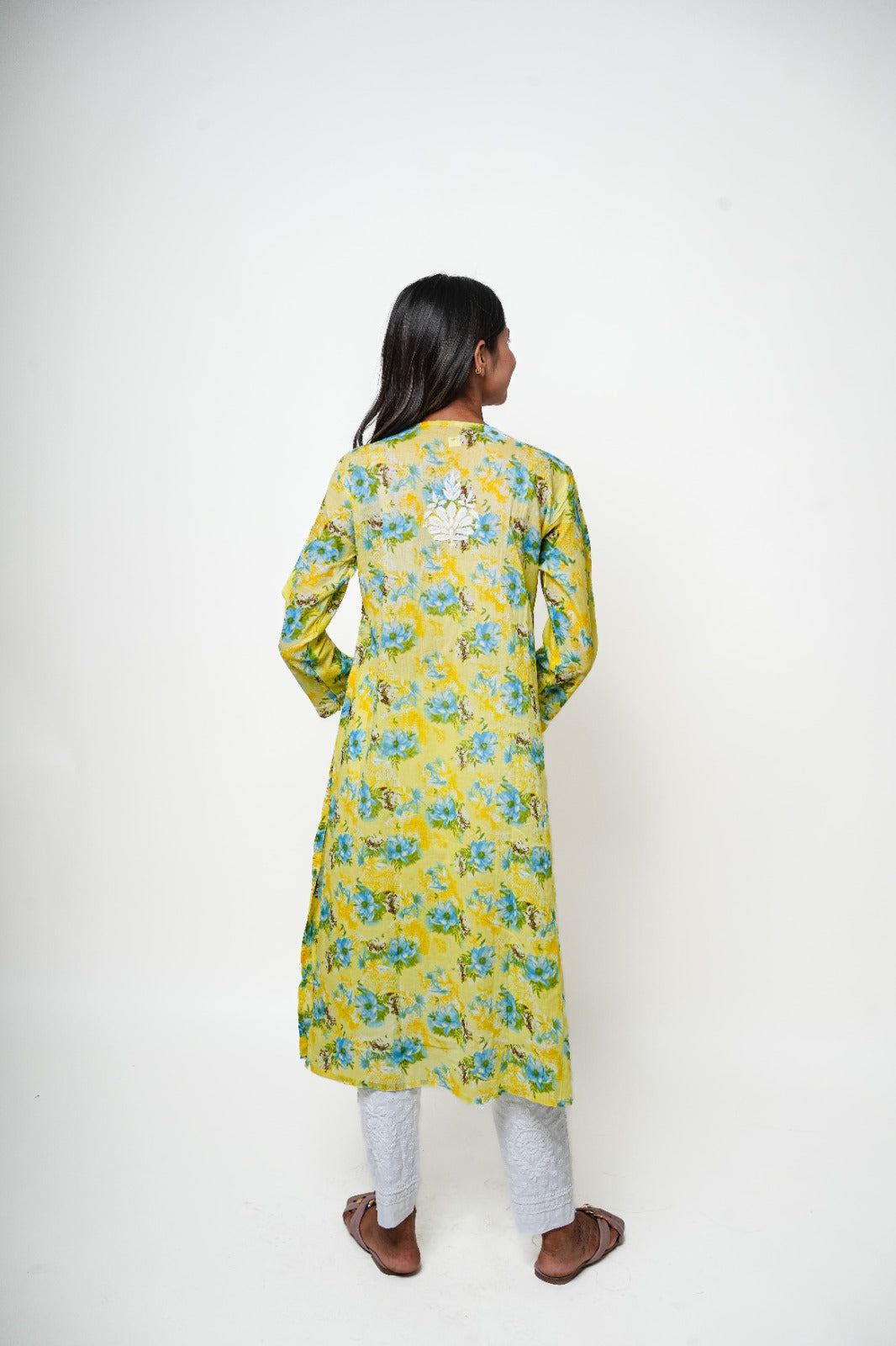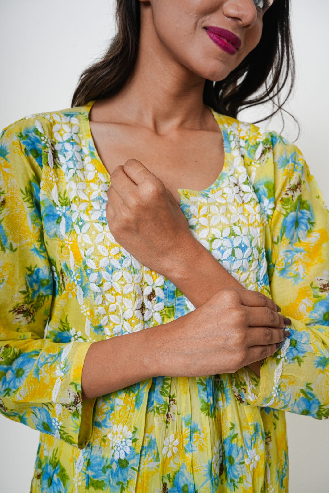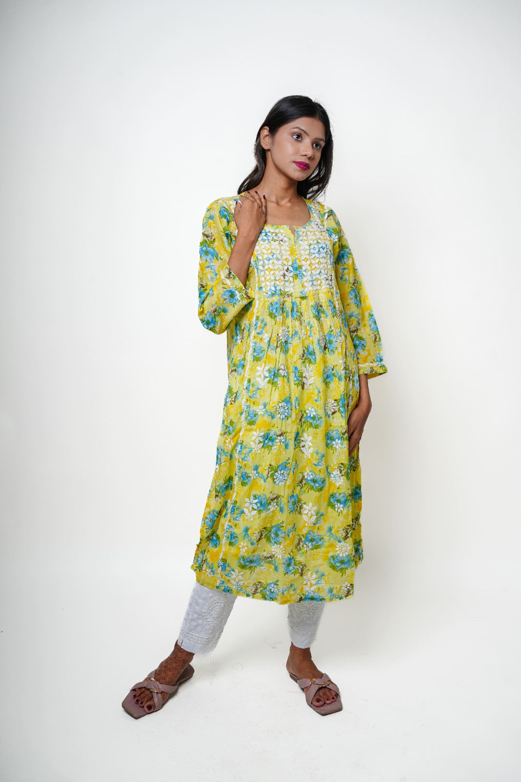 Chikankari hand embroidered | Long Nayra | Mul cotton | Yellow & Green