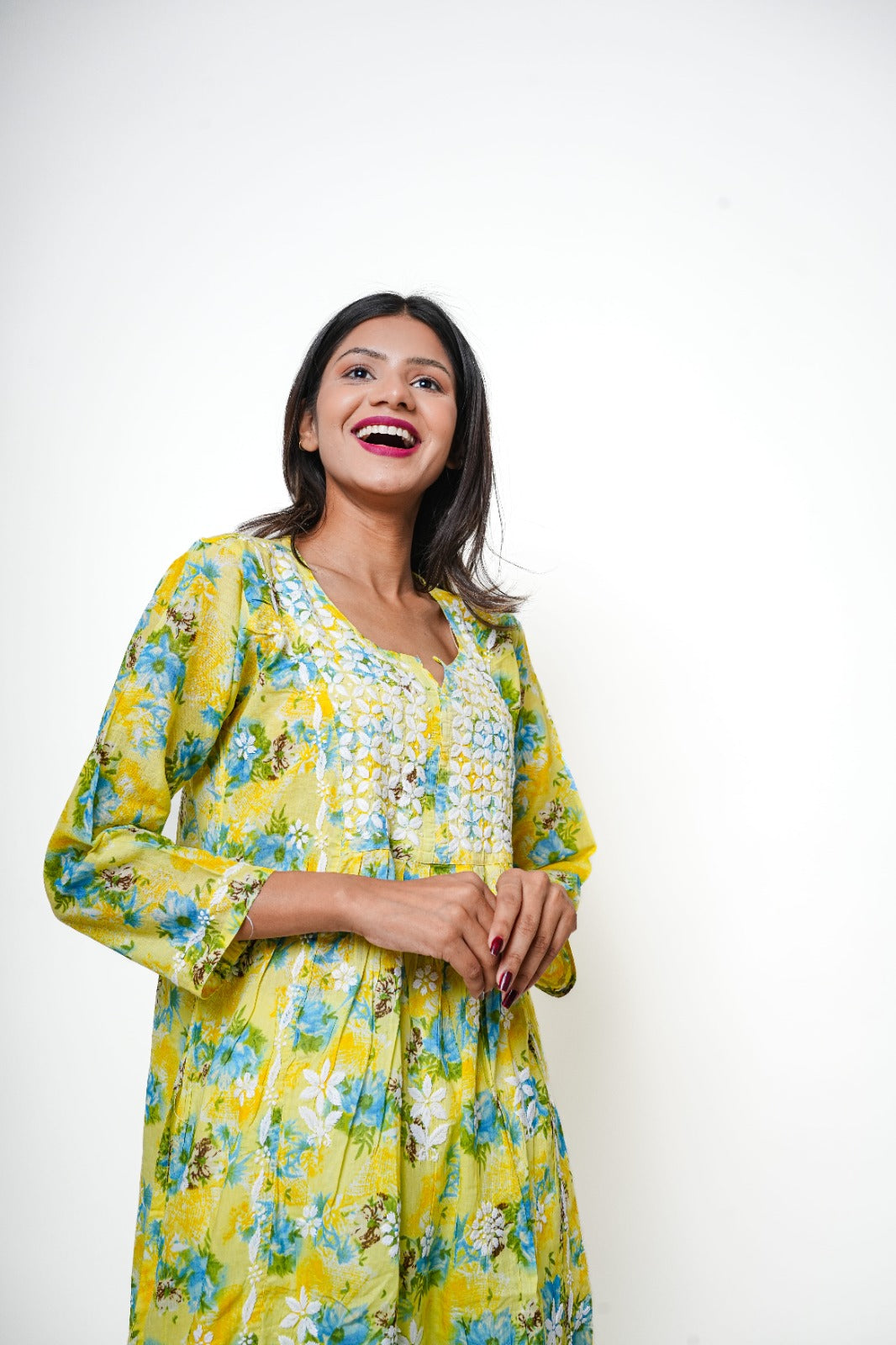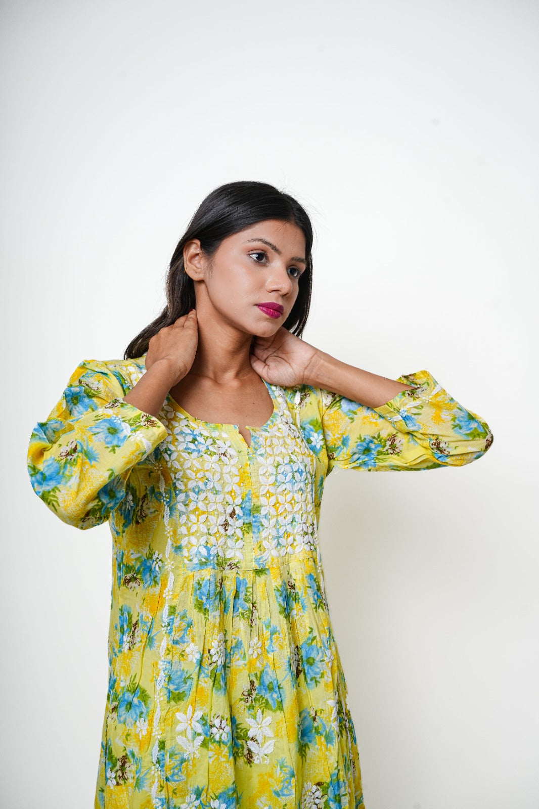 Bring a burst of sunshine to your wardrobe with this yellow Chikankari short kurta, featuring delicate blue and white floral embroidery. Crafted for effortless ethnic style, this breezy piece offers the perfect balance of heritage craftsmanship and modern flair. Ideal for brunches, small festive gatherings, or casual office wear — this is your summer-ready ethnic staple.