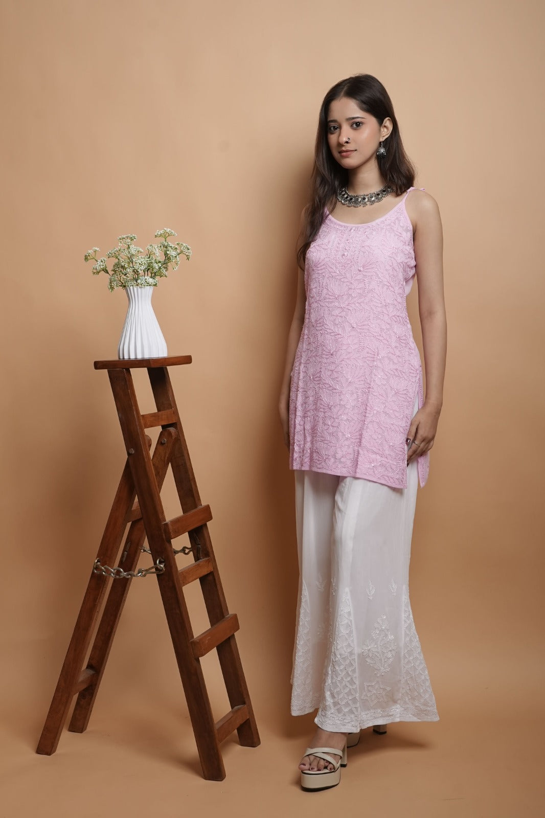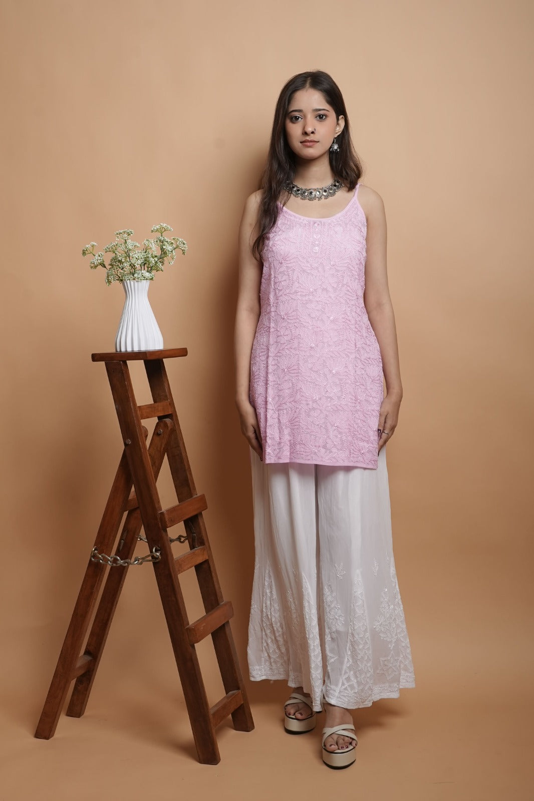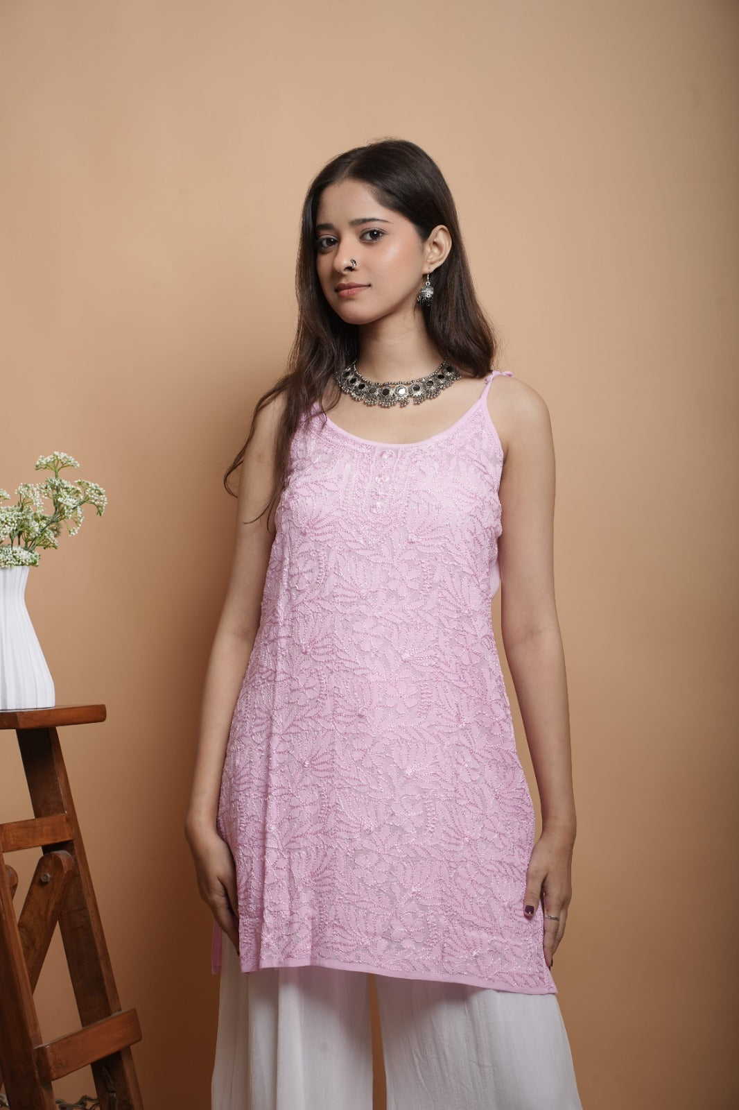 Chikankari Short Noodle strap Kurta | Georgette | Baby Pink |